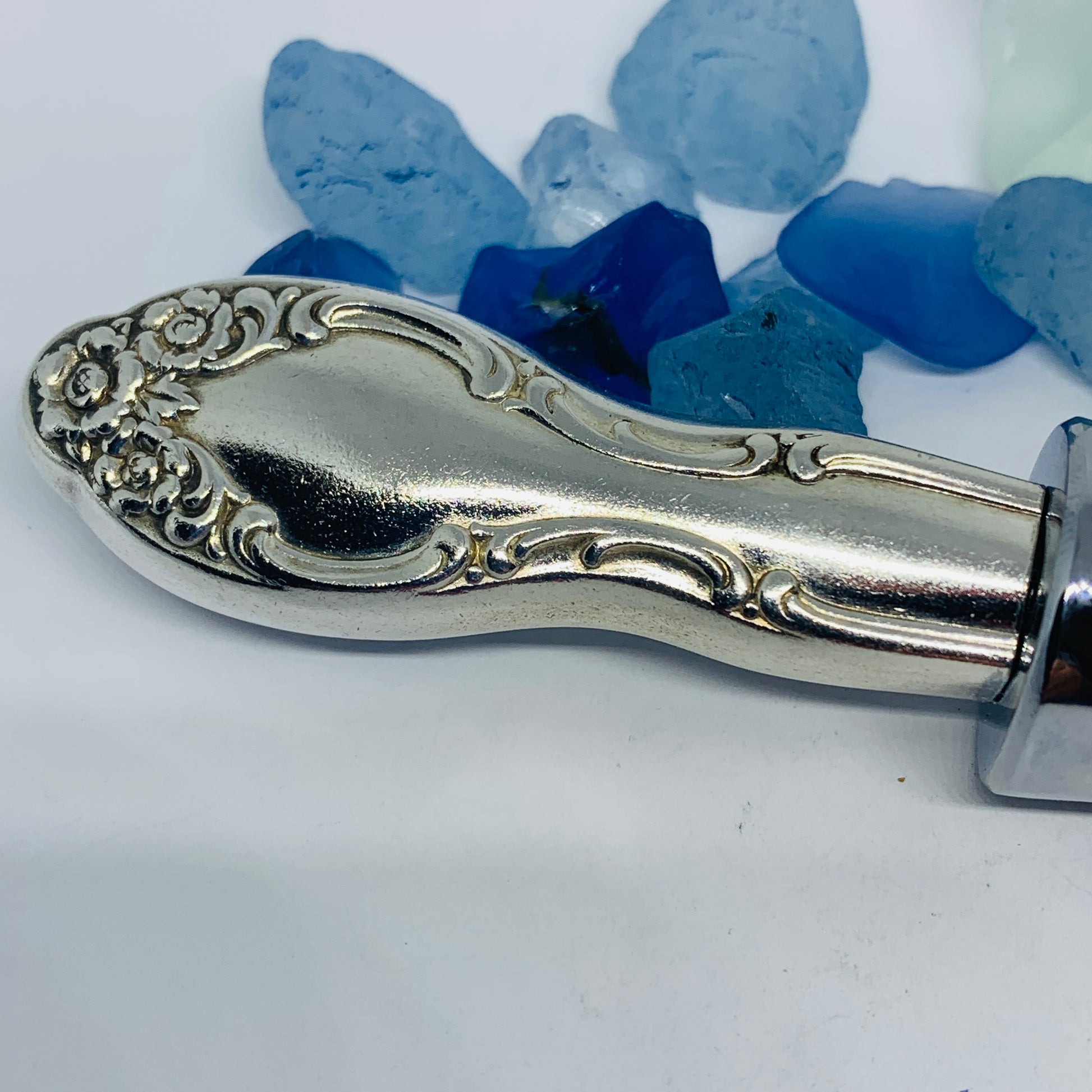 This bottle stopper was created by hand by me from a vintage silver plated knife handle known as "Lady Densmore”.