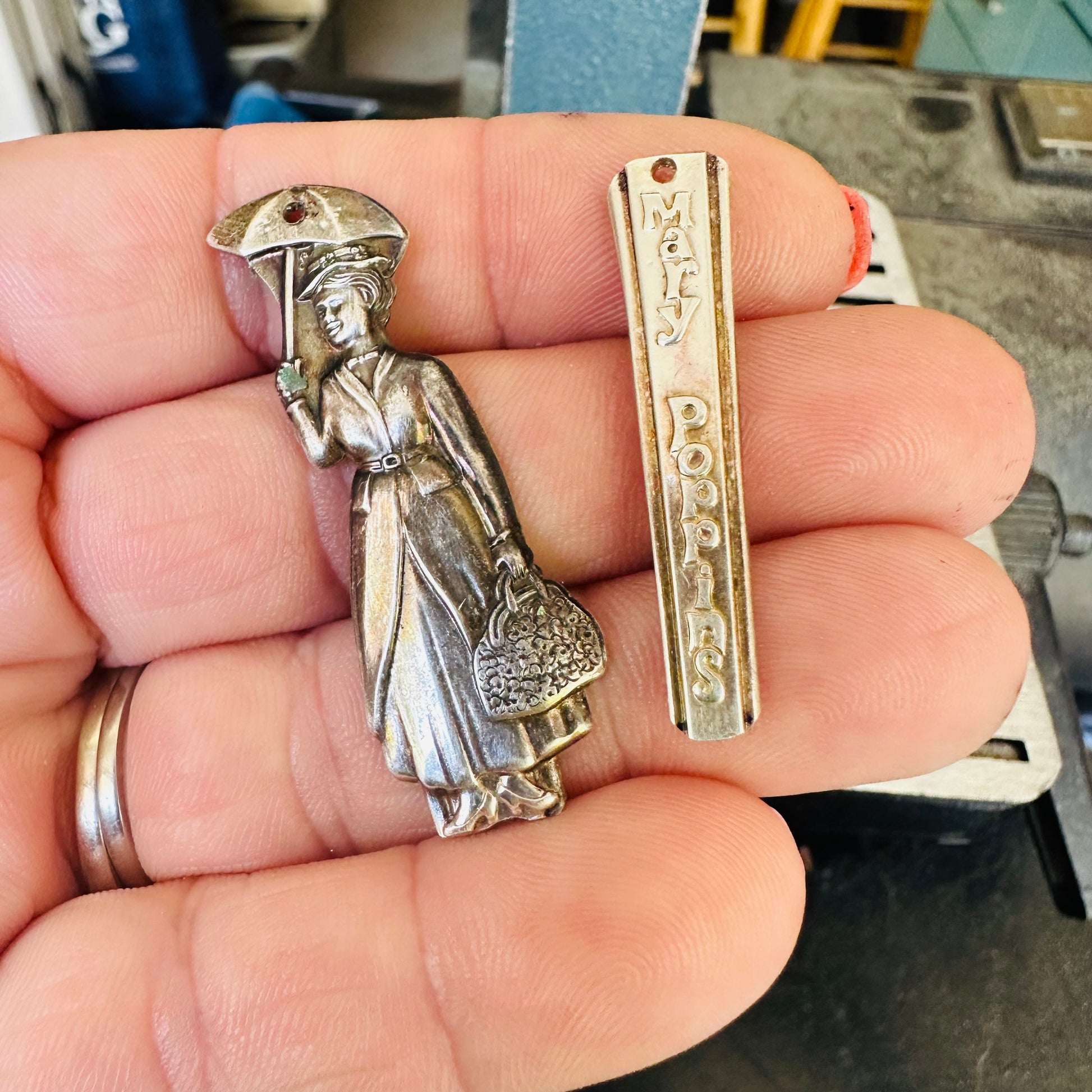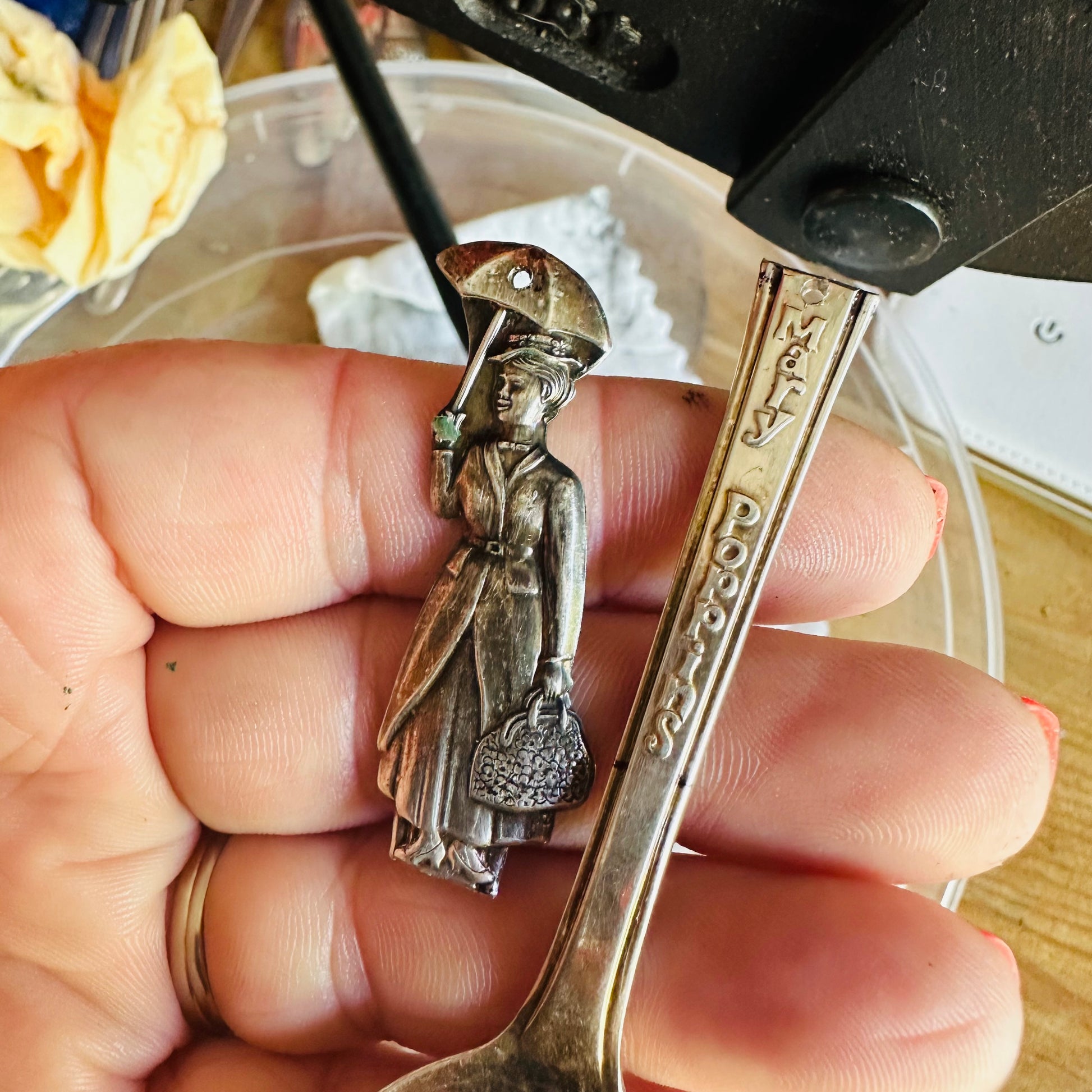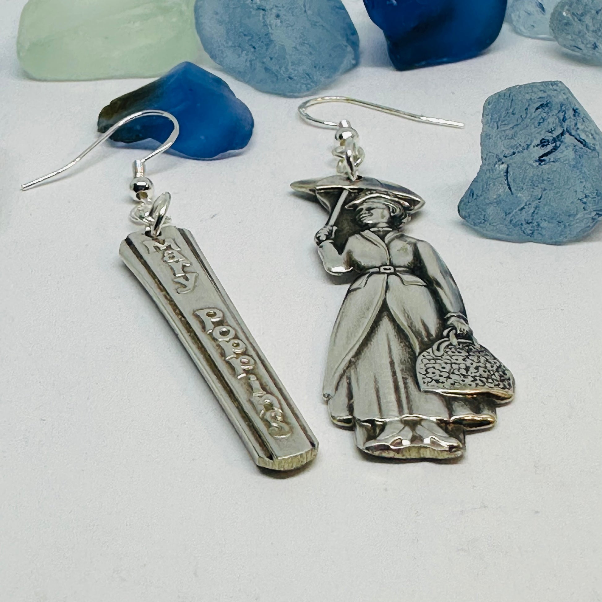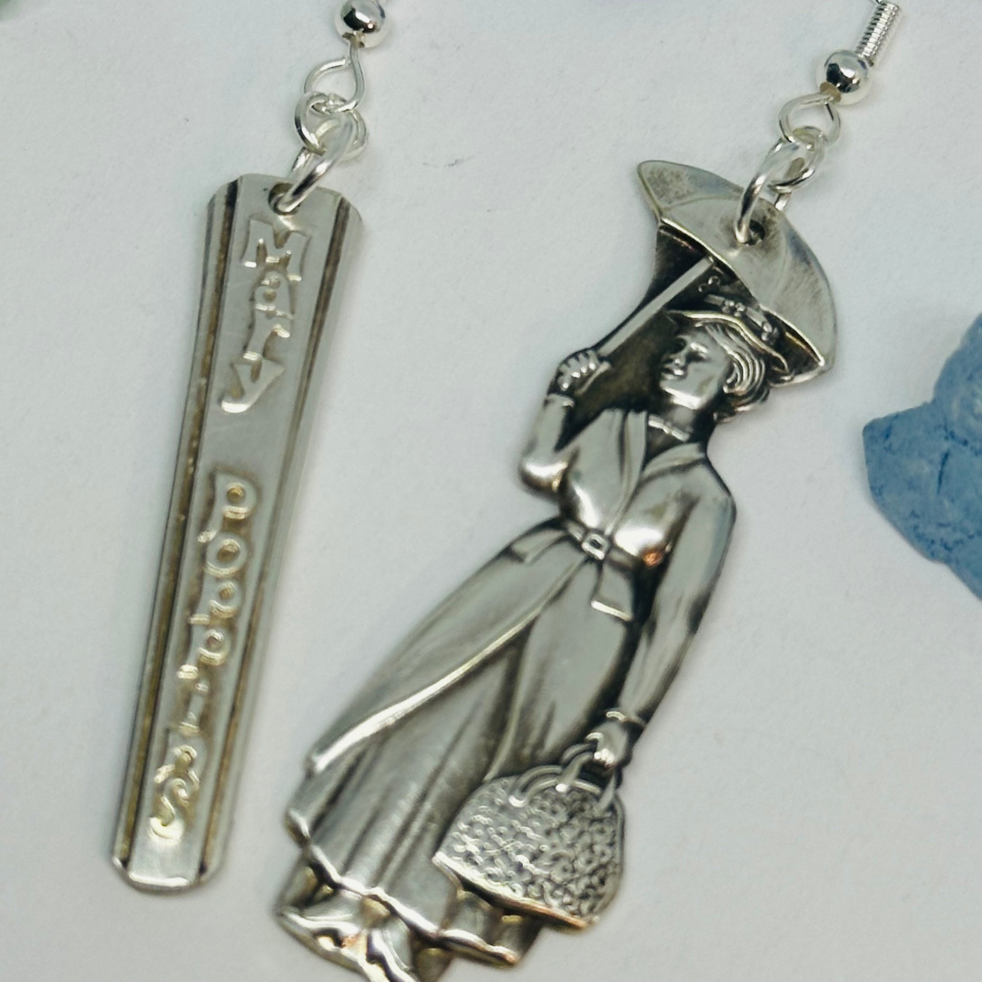 Crafted by my hands, this earring set in made from a vintage (1964) silver plated Mary Poppins (Disney Productions) collectable spoon. Earring hooks and jump rings are sterling silver. Add a touch of nostalgia to your jewelry collection!