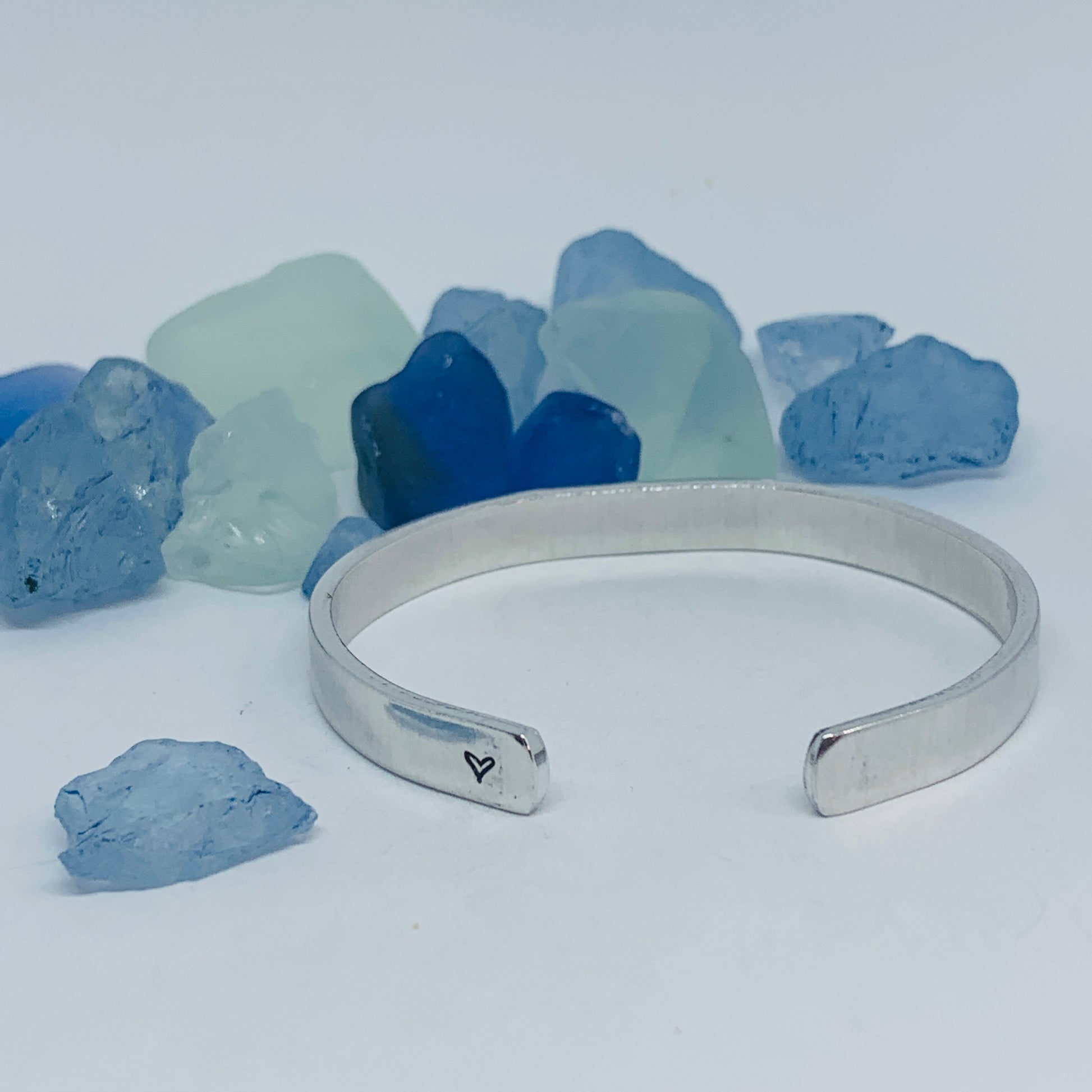The words “Nauti” and “Girl” adorn this hand stamped cuff bracelet separated by an anchor design and centered on the outside. A sweet little heart is stamped inside on each far end. 6”x1/4”