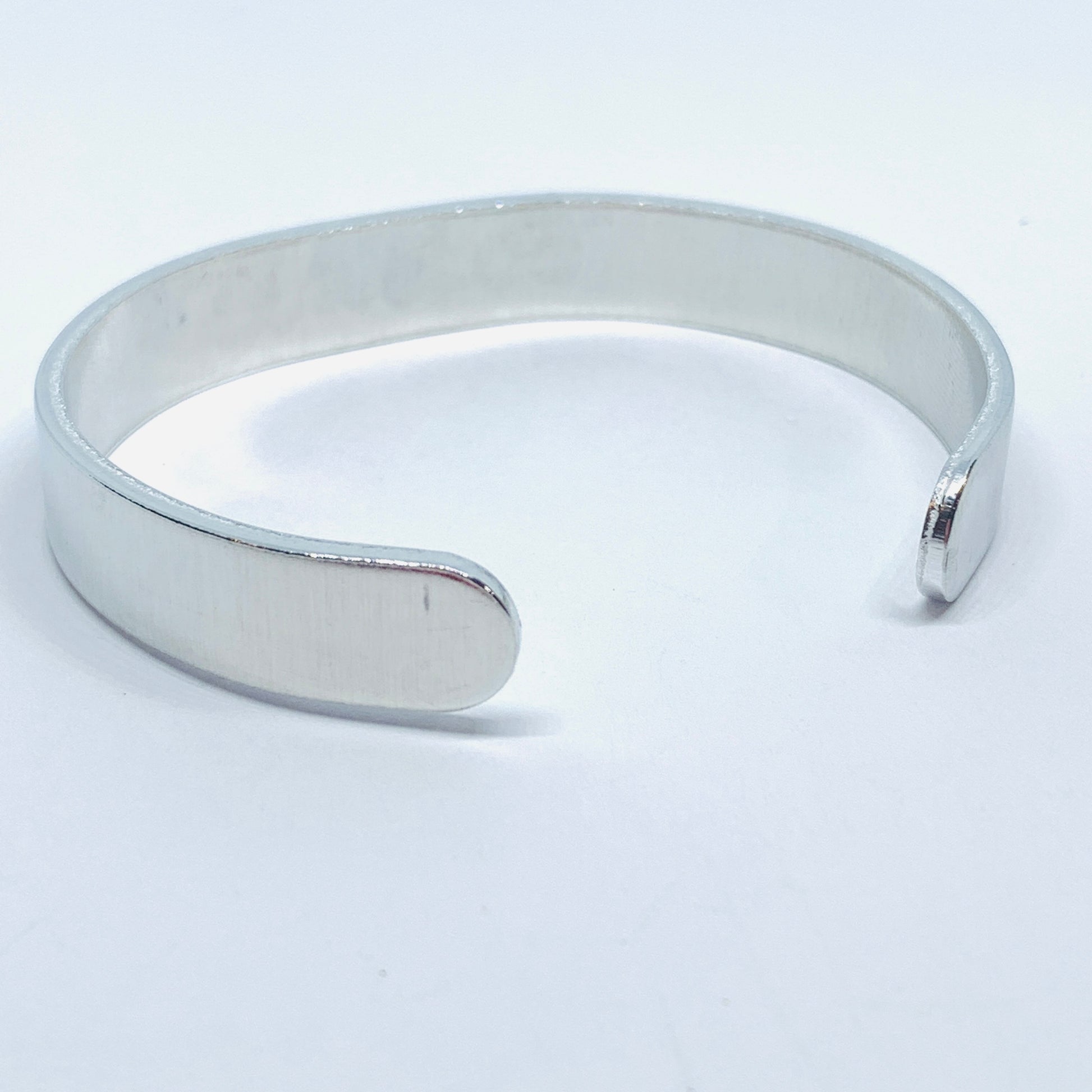I personally hand stamp all of the lettering and designs in my studio. Each design is hand aligned and punched into the metal, so the placement of the wording and designs will vary slightly from piece to piece. After stamping, I darken the impressions so they stand out. To retain the contrast, it is highly recommended that the piece is not exposed to excessive moisture (bathing, swimming, exercise).