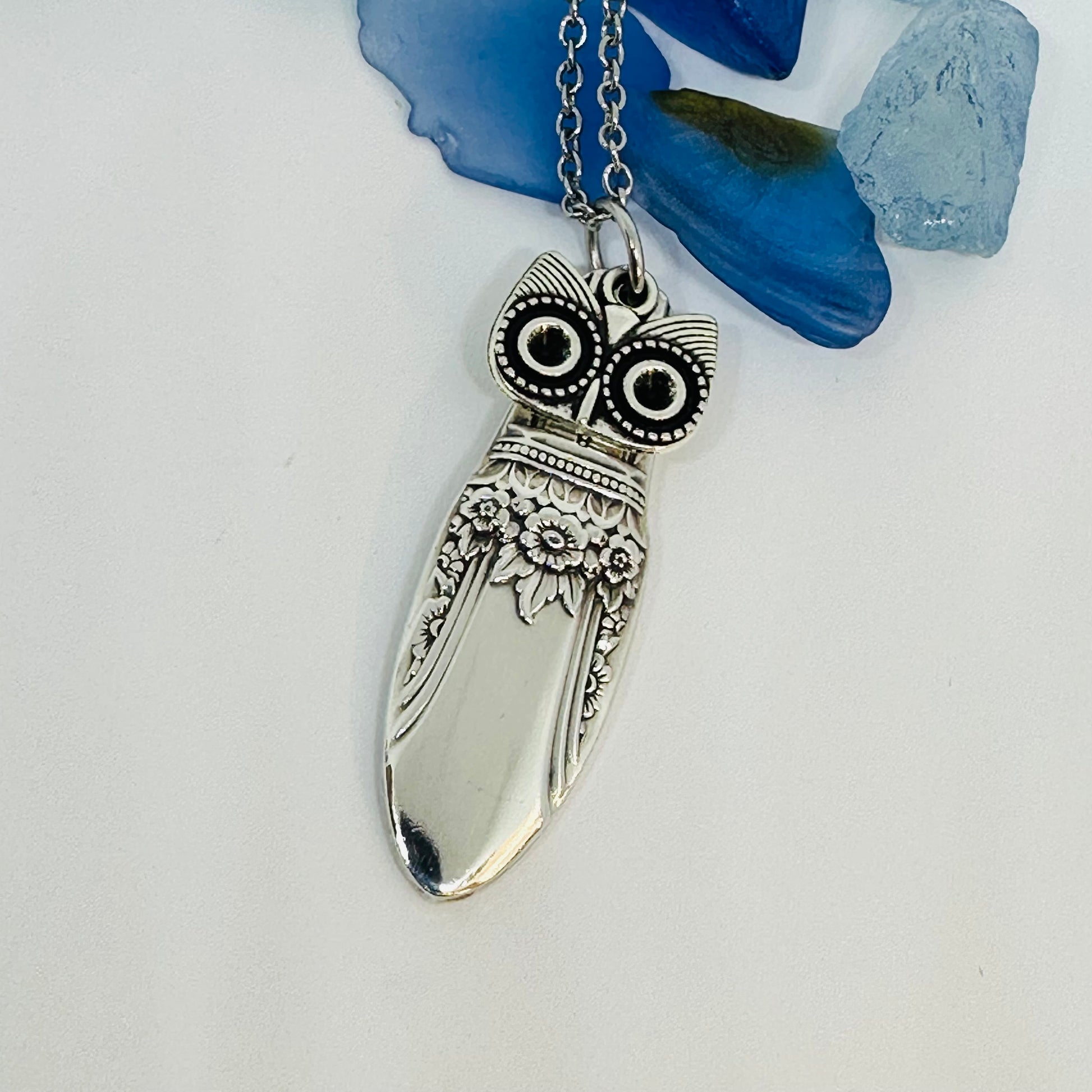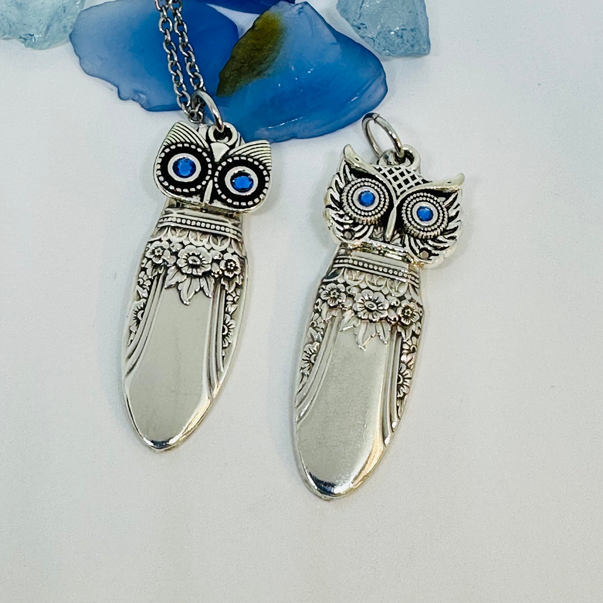 Owl with Birthstone Eyes “First Love” 1937 Vintage Silverware Necklace | Up-Cycled Jewelry | Birthday Pendant | Antique | 2.6mm Swarovski Eyes