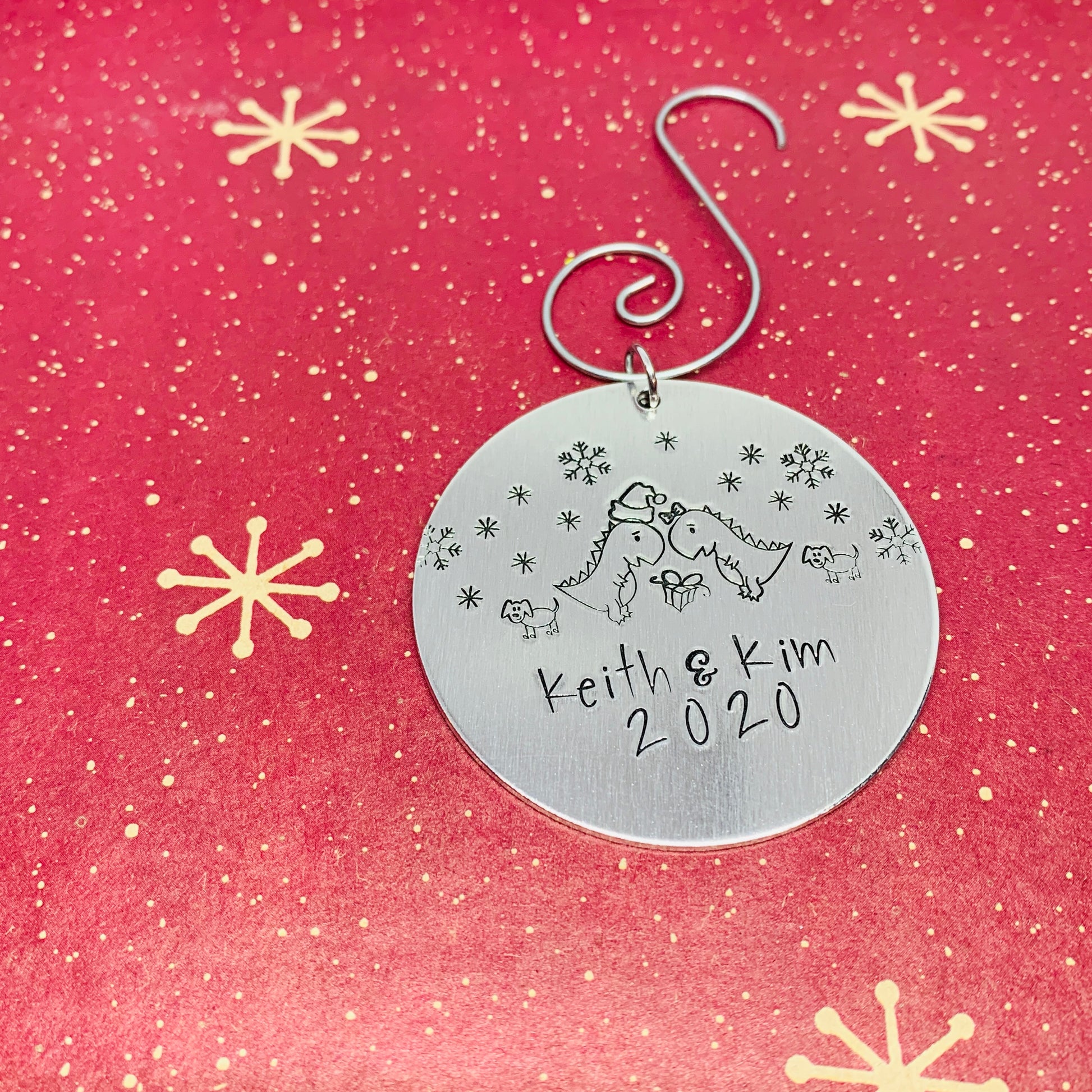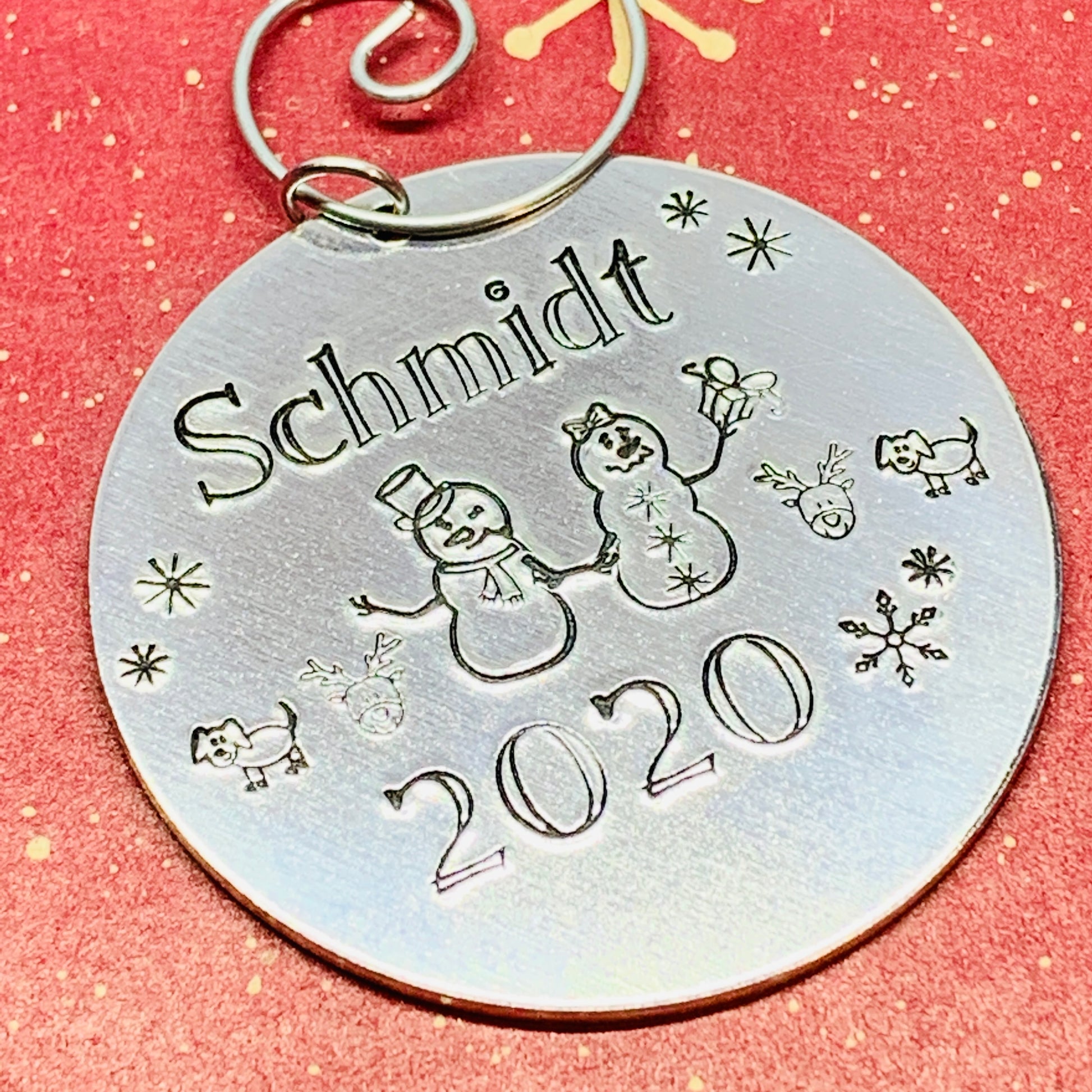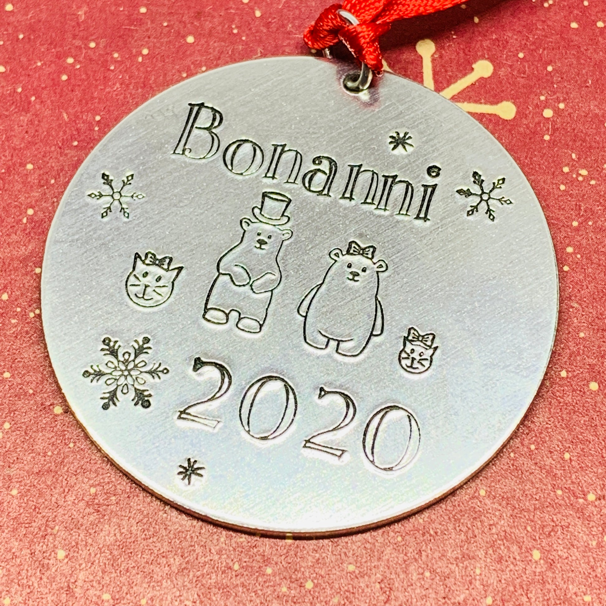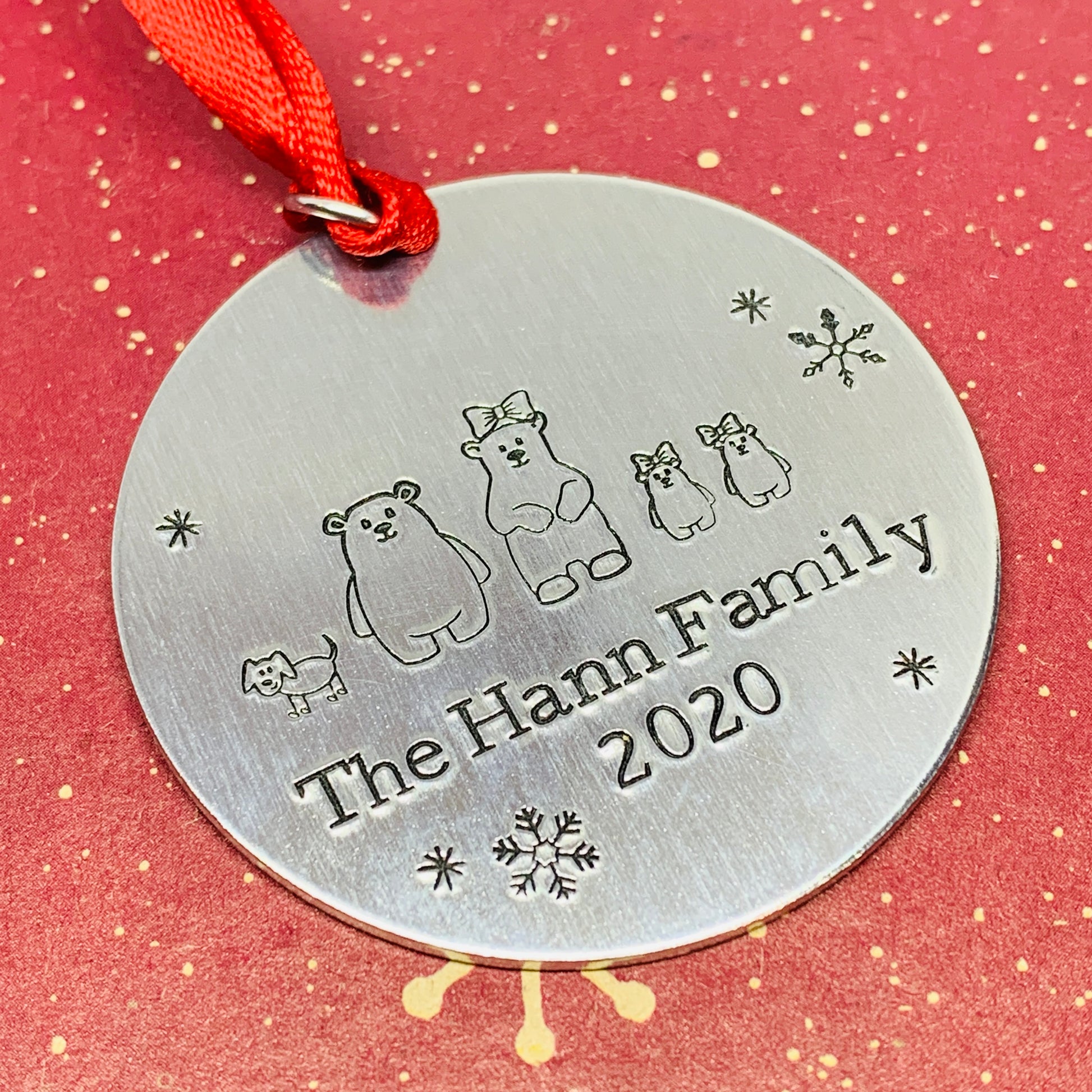 2” round, aluminum ornament features hand stamped designs to represent your family! Include you family name and year for a perfect annual holiday ornament!