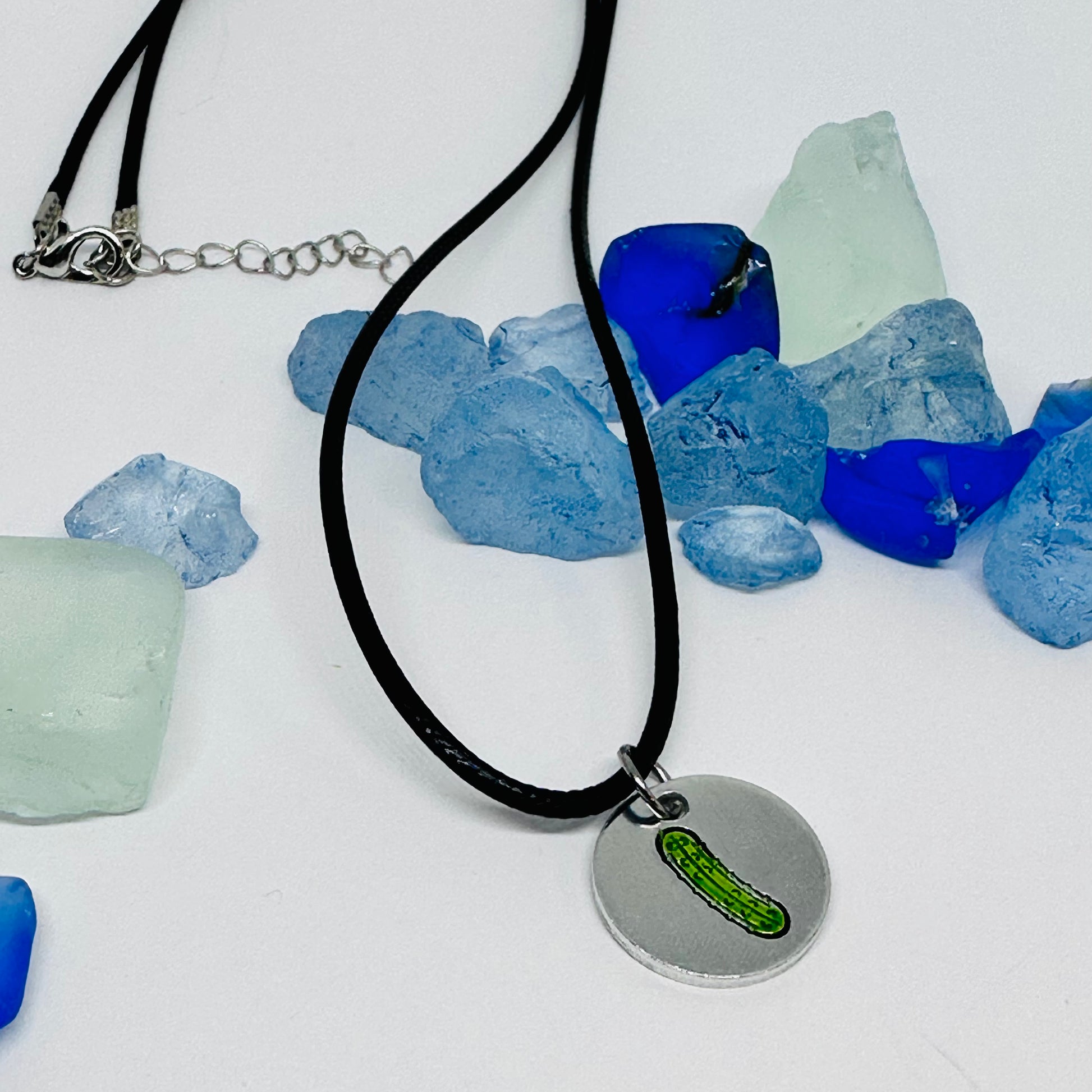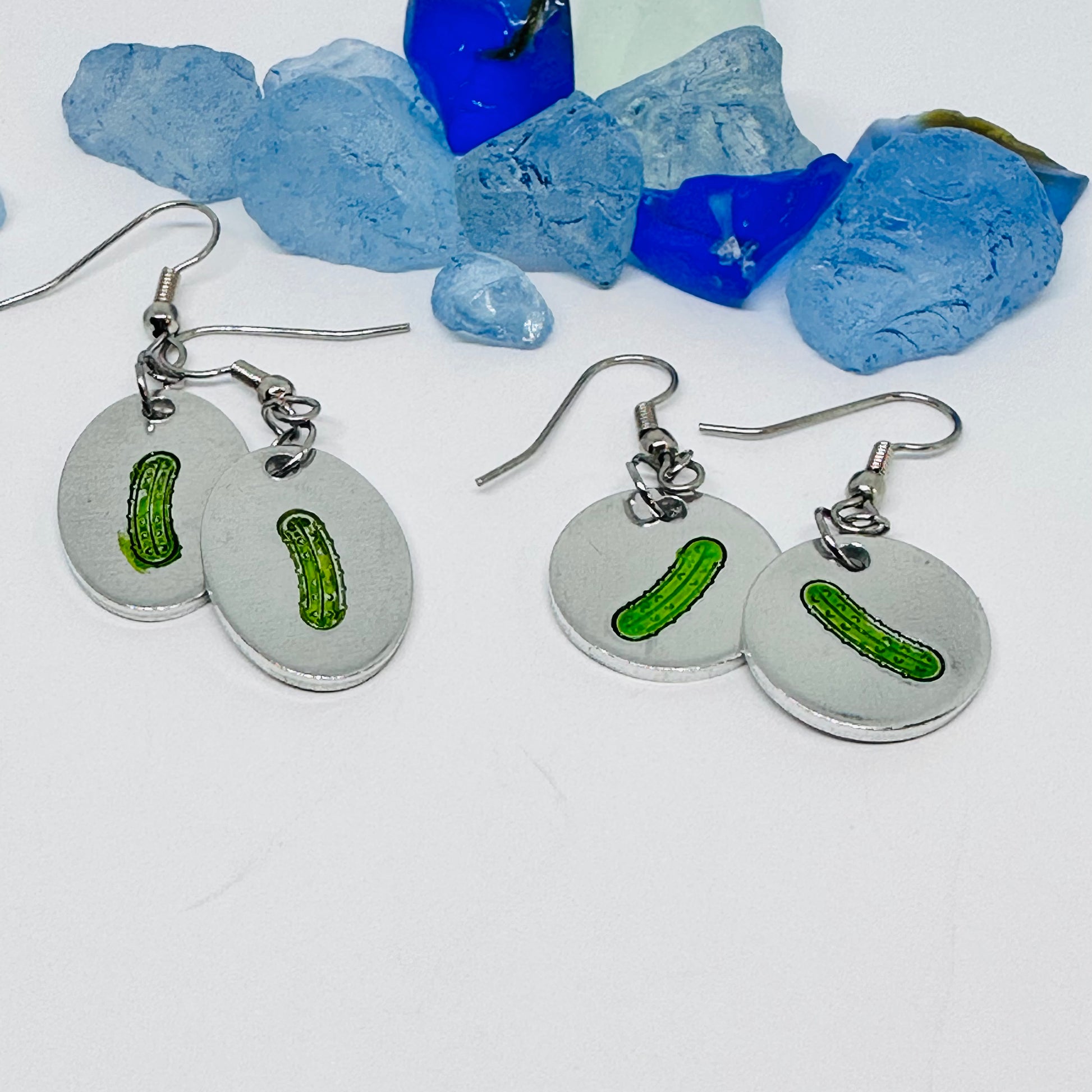 These fun and unique aluminum 1” oval earrings feature a hand stamped pickle design which is hand painted, and include surgical steel ear wires for your comfort.