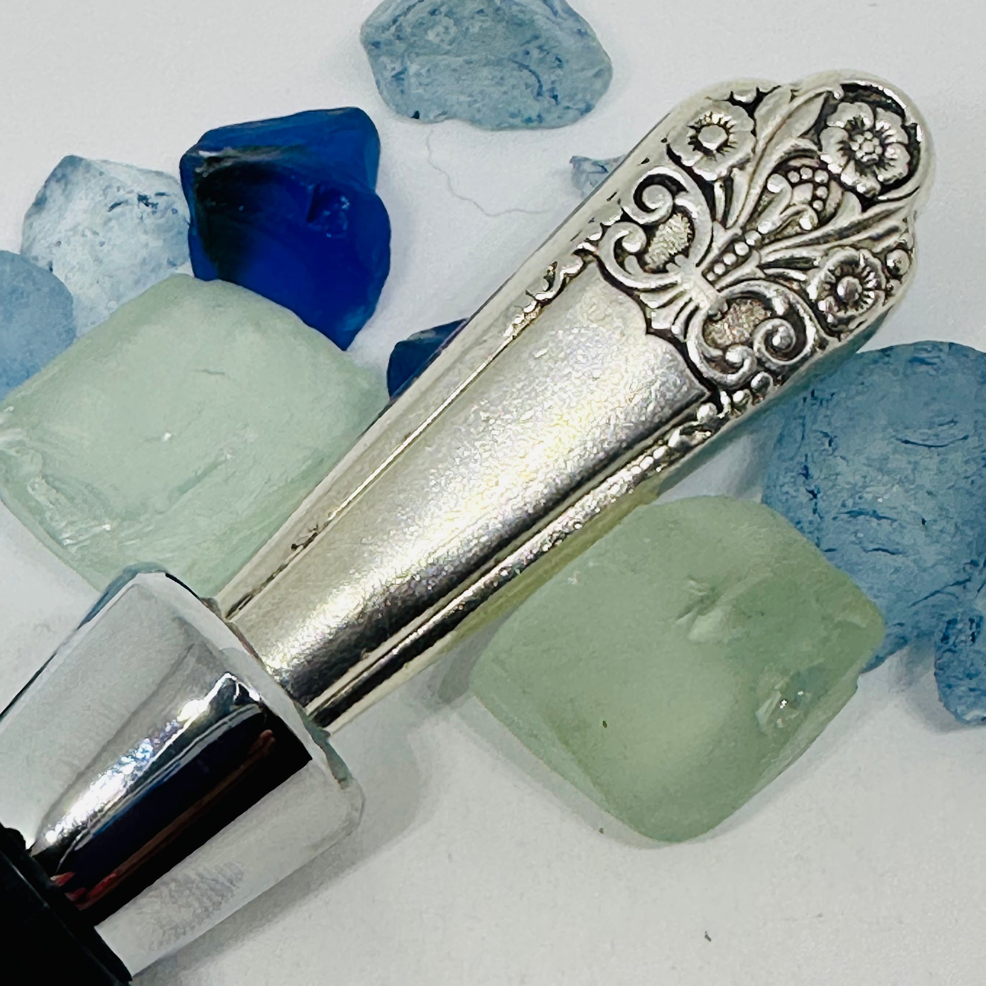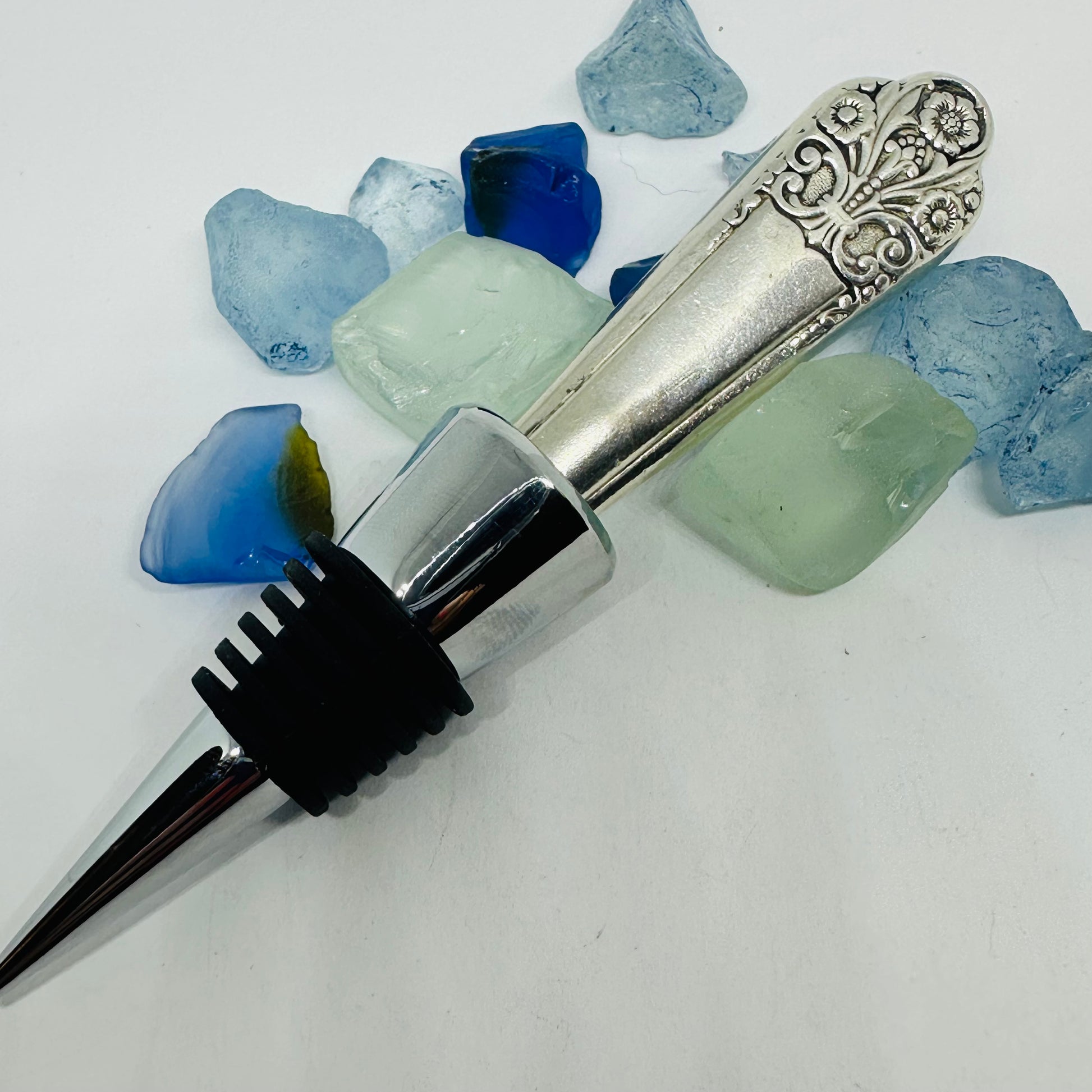 This wine bottle stopper was created by hand by me from a vintage silver plated knife handle known as “Precious”.