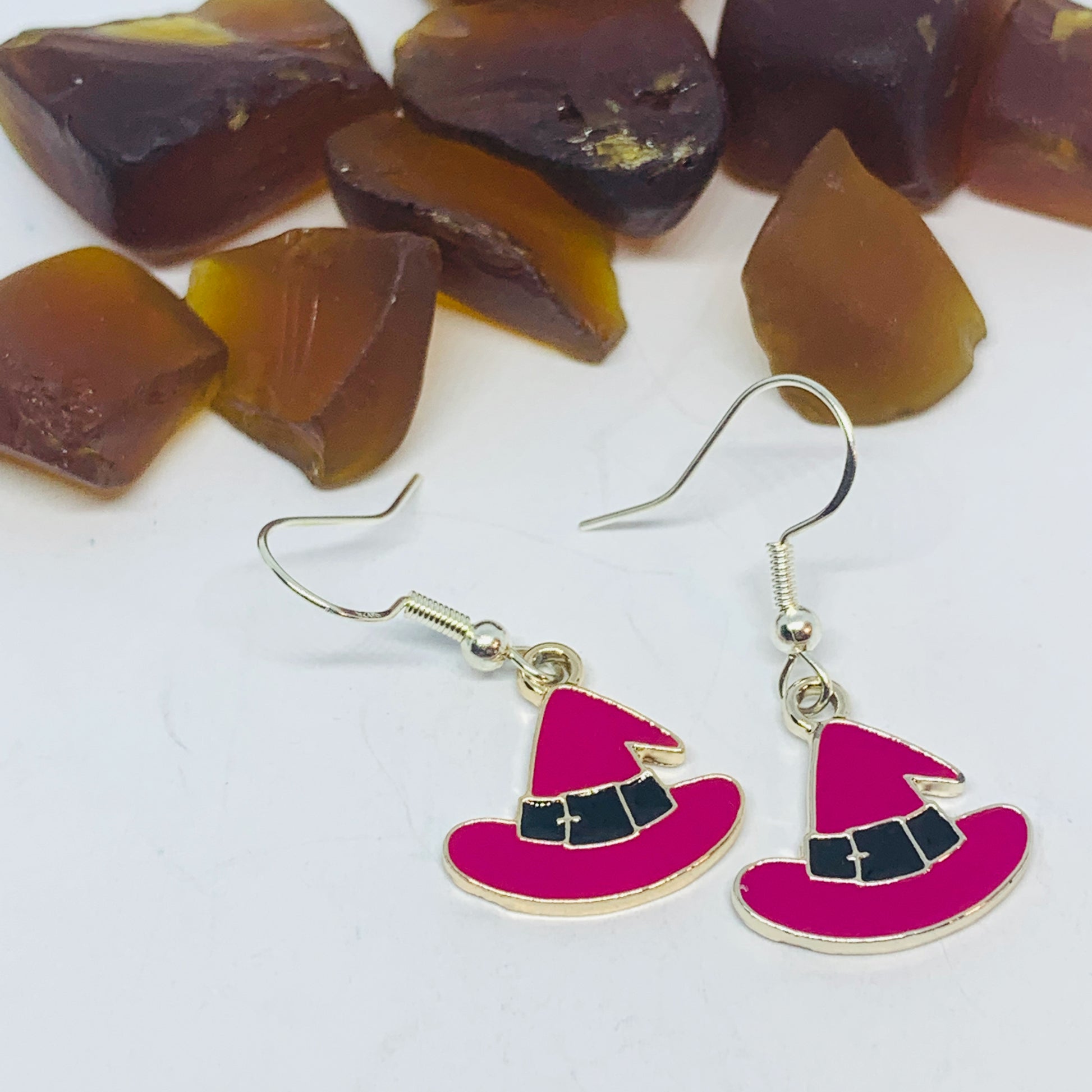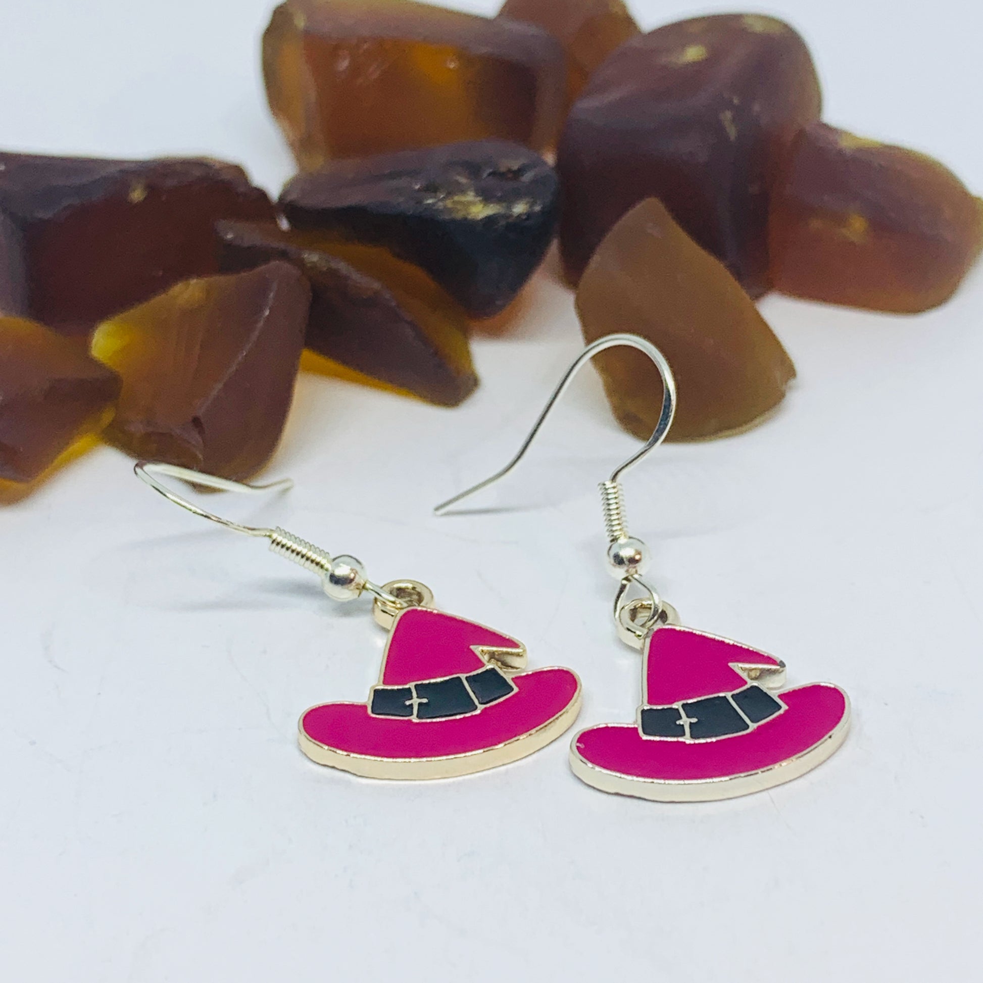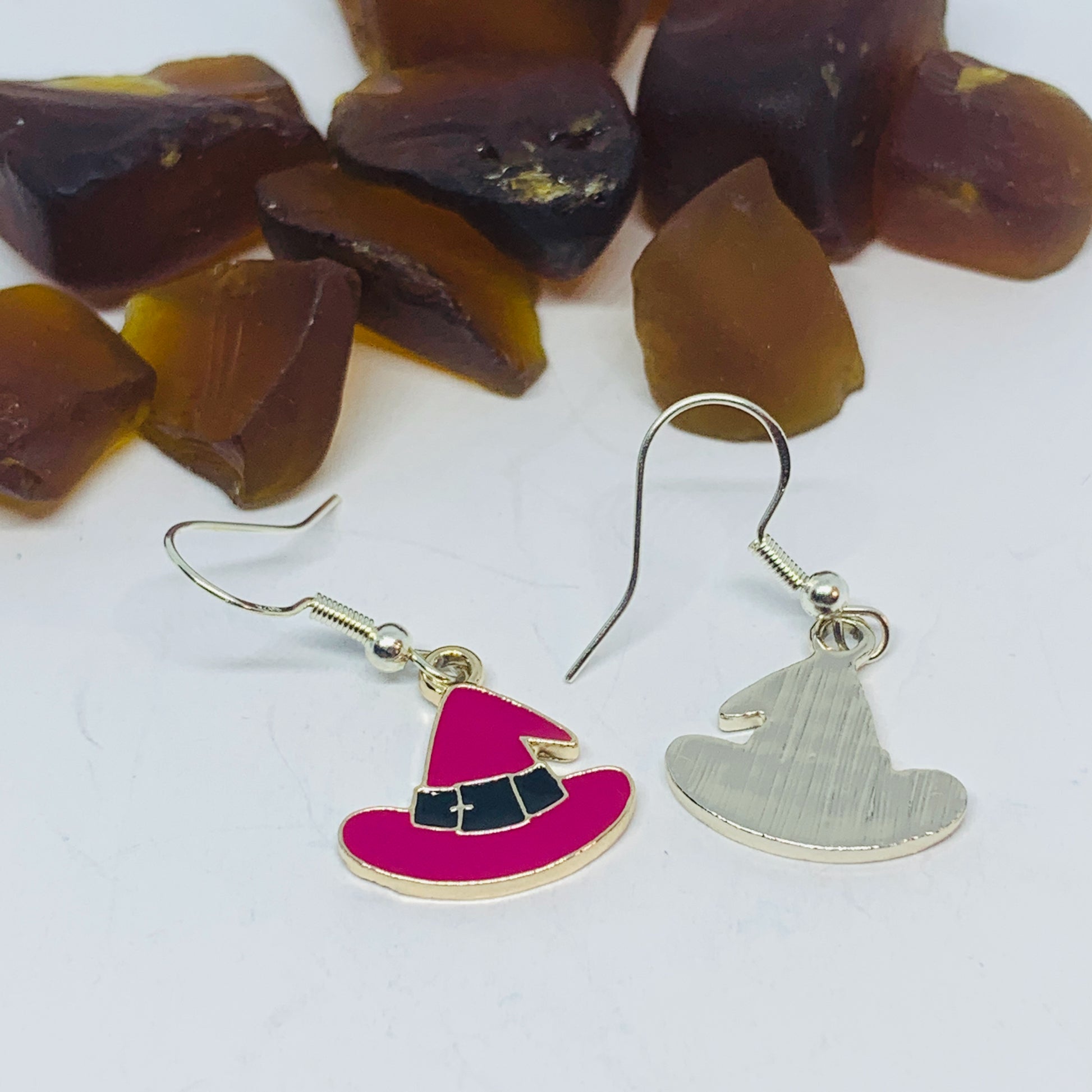 These colorful enamel earrings feature super fun purple and gold tone witches hat! They are attached to sterling silver ear wires. They come with clear earring backs to prevent loss!