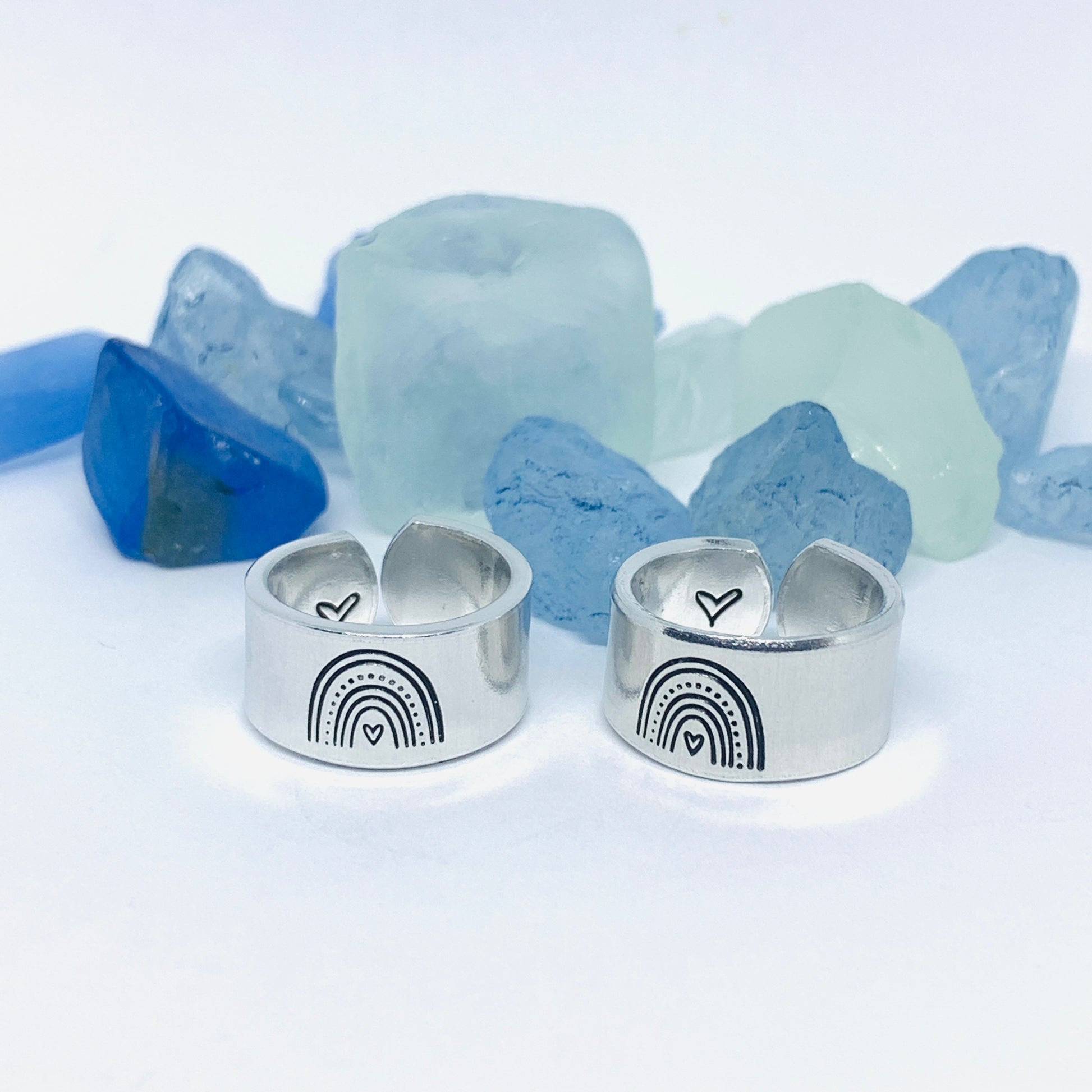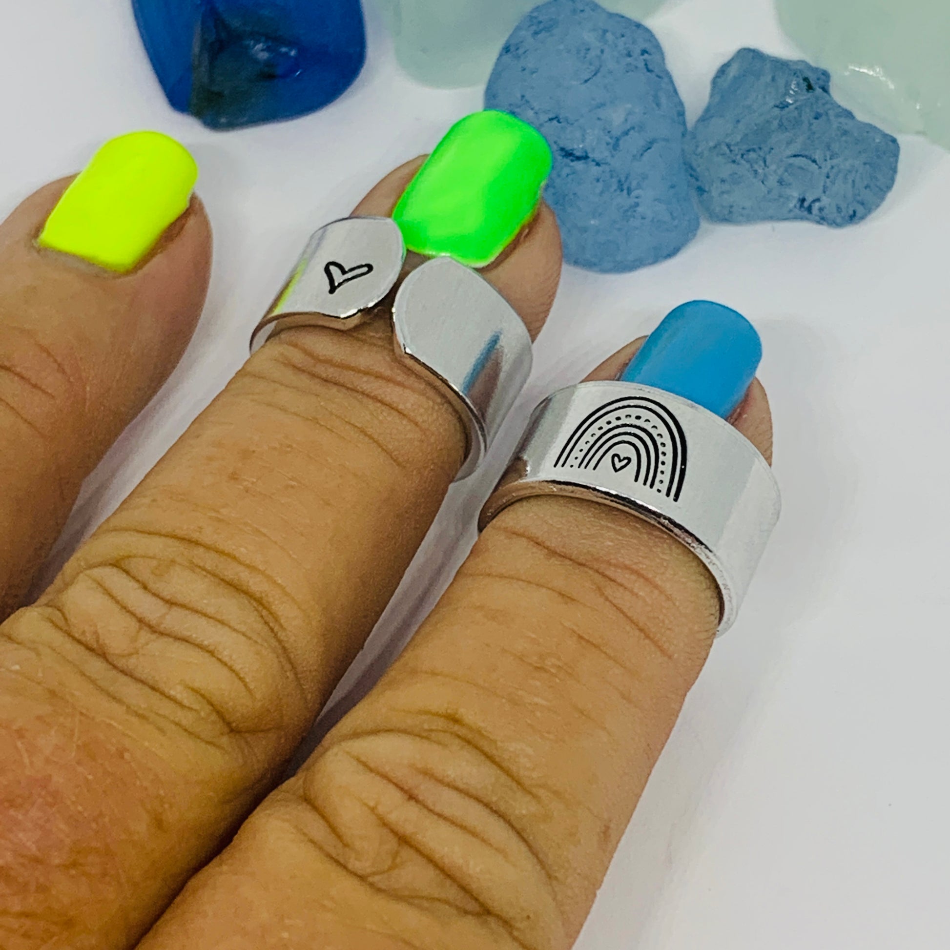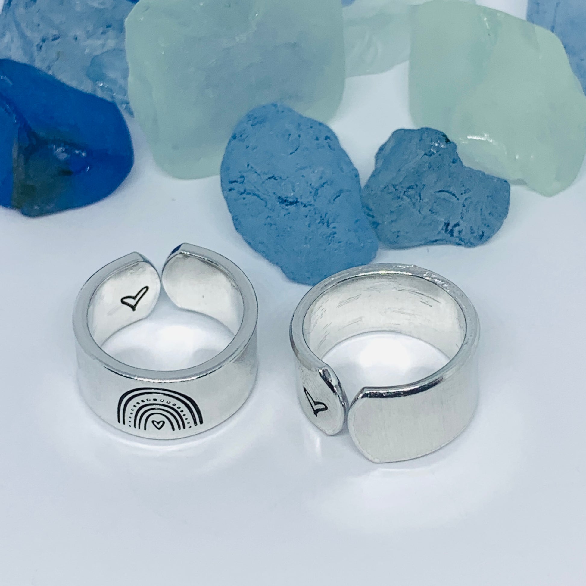 A rainbow and heart design is featured front and center on this hand crafted ring with a small hand drawn heart design stamped on the far end - one outside, one in.