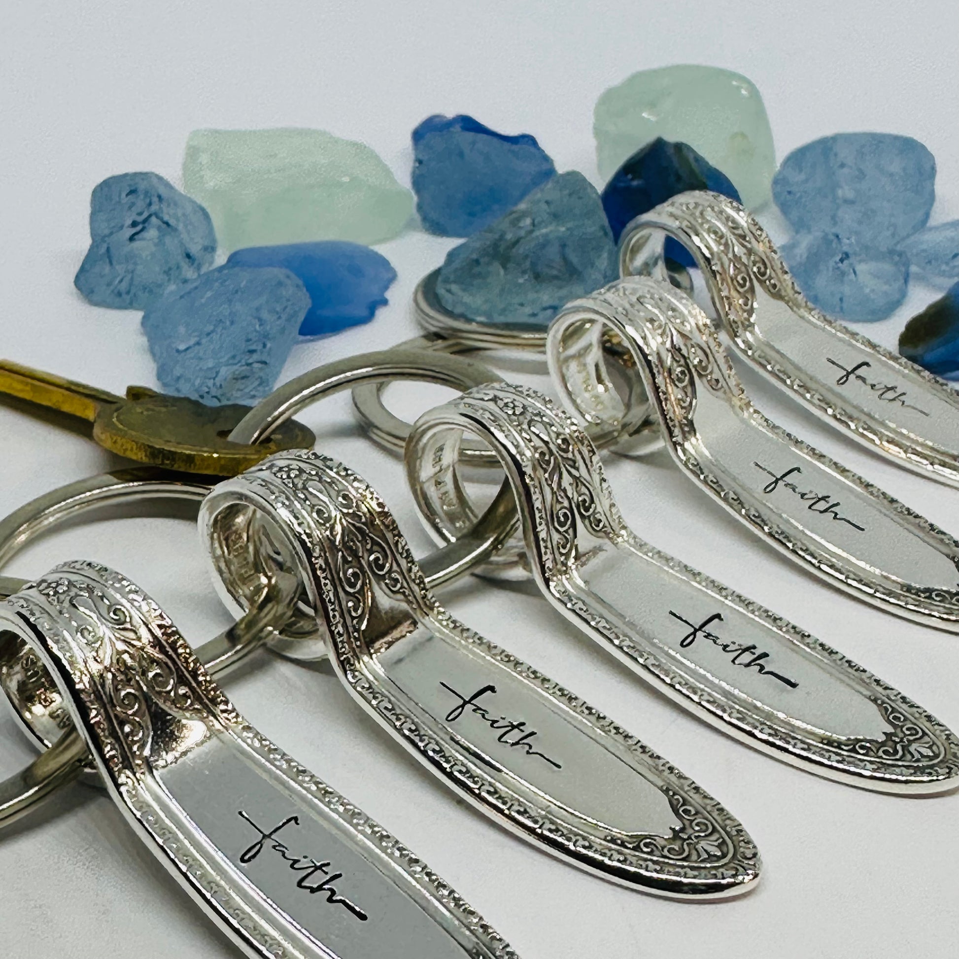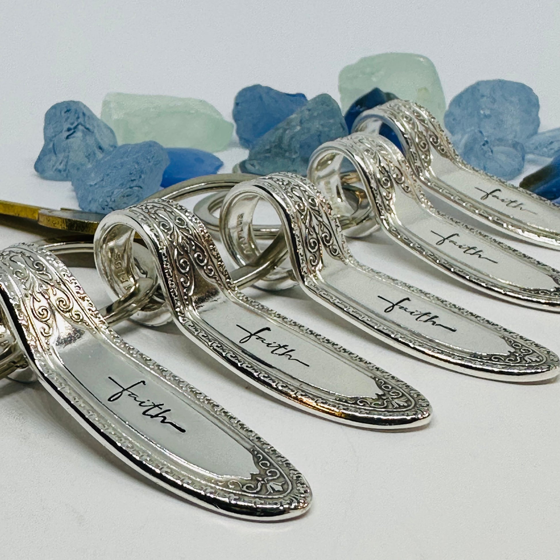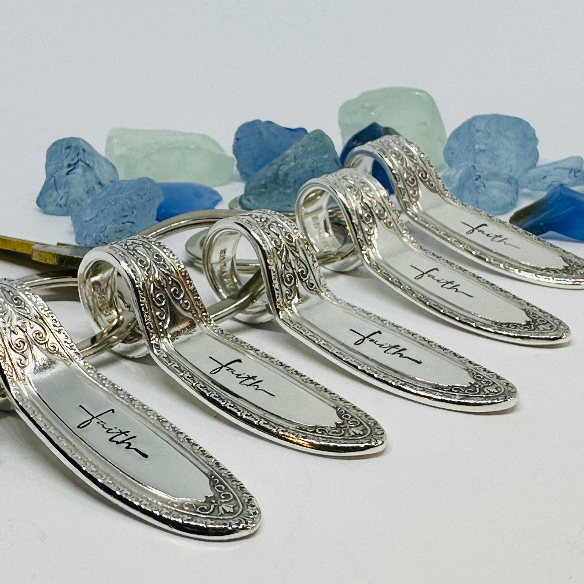 "Ramona-Lakewood-Brentwood” Vintage Silverware Hand Stamped Key Ring - “Faith” | Silverplate 1928