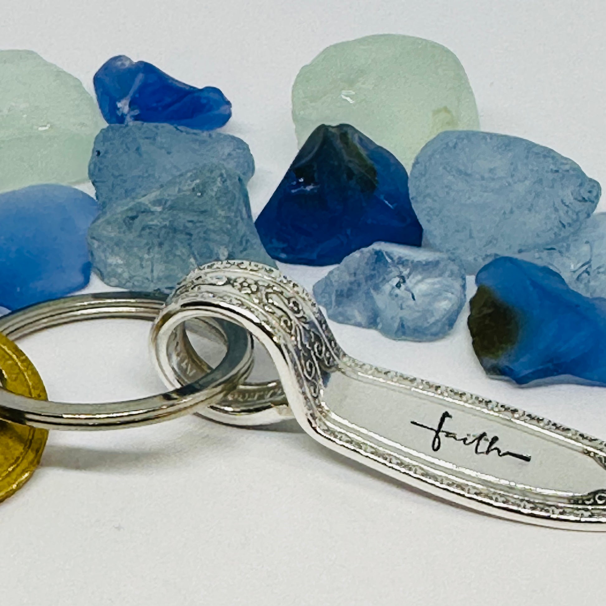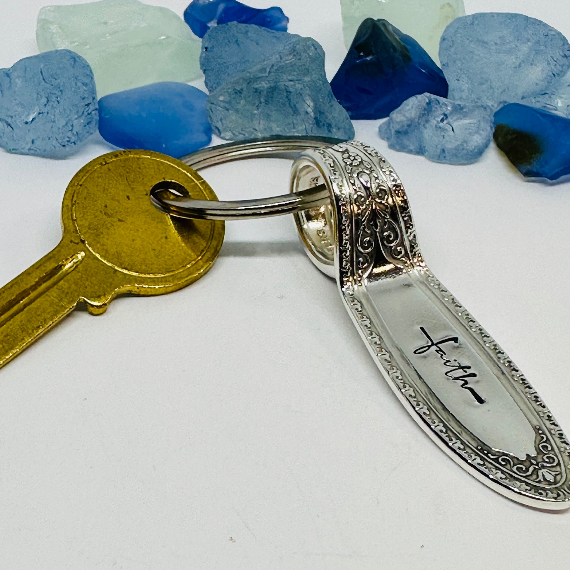 This key ring was created by hand by me from a vintage silver plated spoon or fork handle. I hand stamped the word “faith” on it as well!
