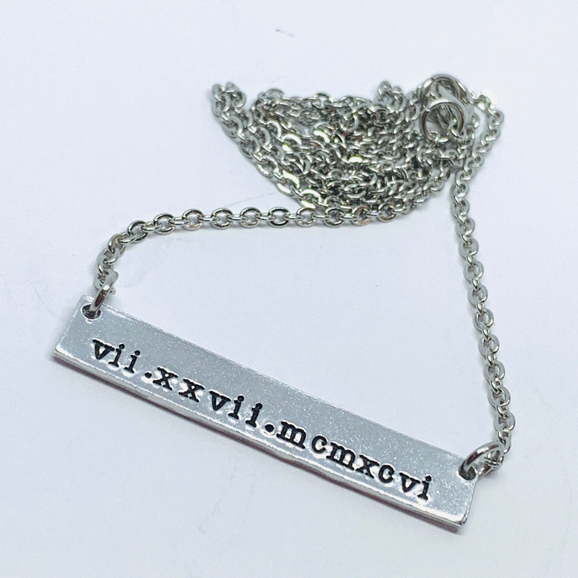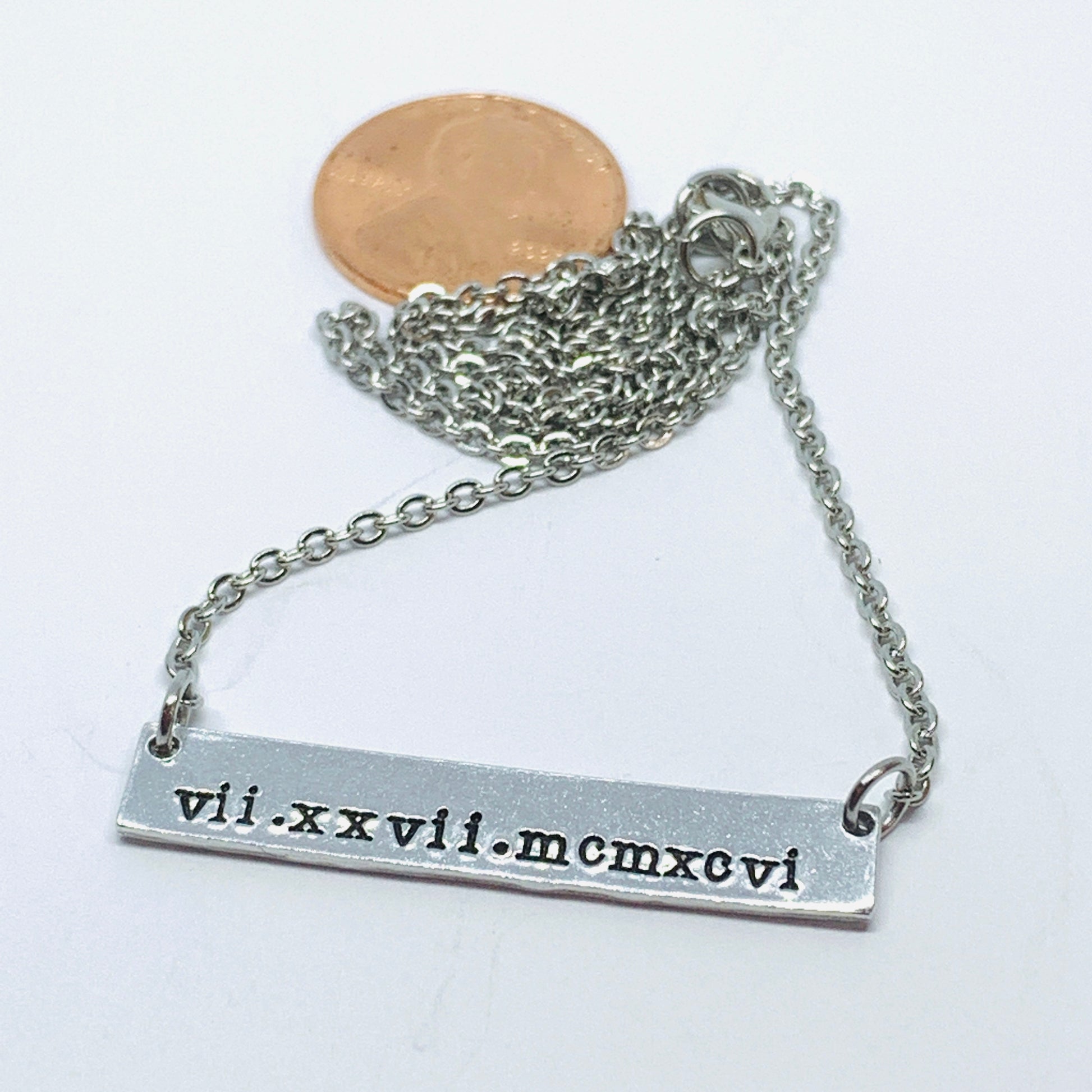 I personally hand stamp all of the lettering and designs in my NJ studio. Each character is hand aligned and punched into the metal, so the placement of the wording and designs will vary slightly from piece to piece. Each token will vary slightly from the other but will be very similar to what you see in the photos. After stamping, I darken the impressions so they stand out. To retain the contrast, it is highly recommended that the piece is not exposed to excessive moisture (bathing, swimming, exercise).