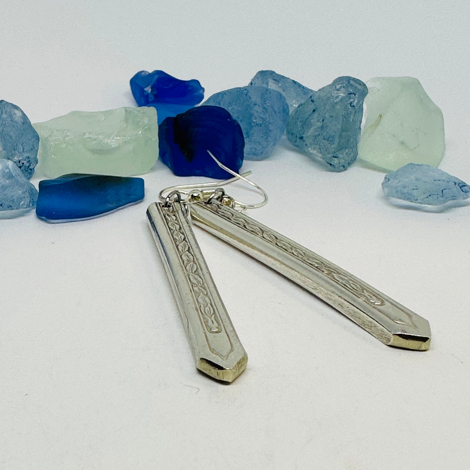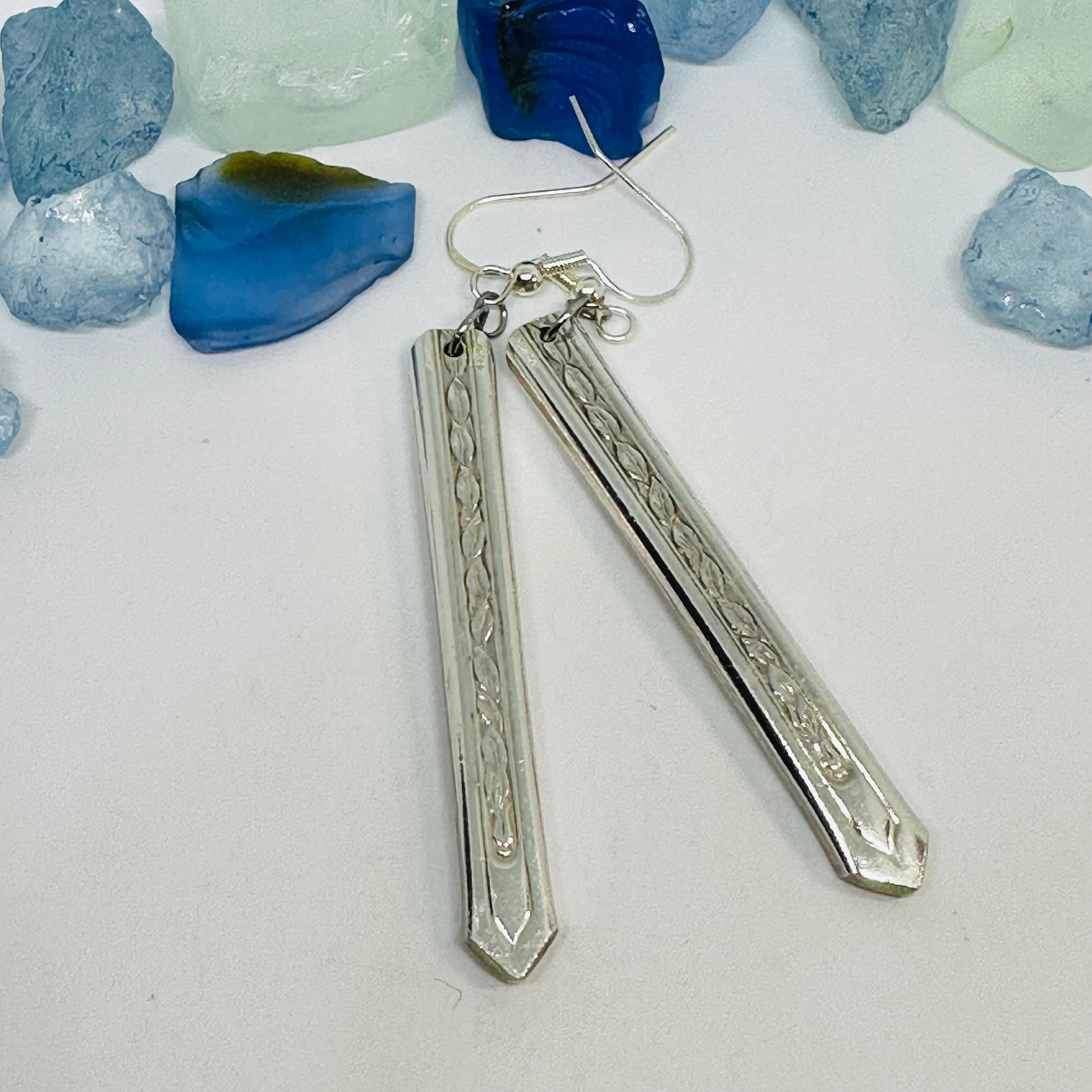 This listing is for a pair of earrings, created by hand from vintage silver plated spoon handles. They measure approximately 2”. They originate from the silverware pattern named “Rose and Leaf” from 1937.