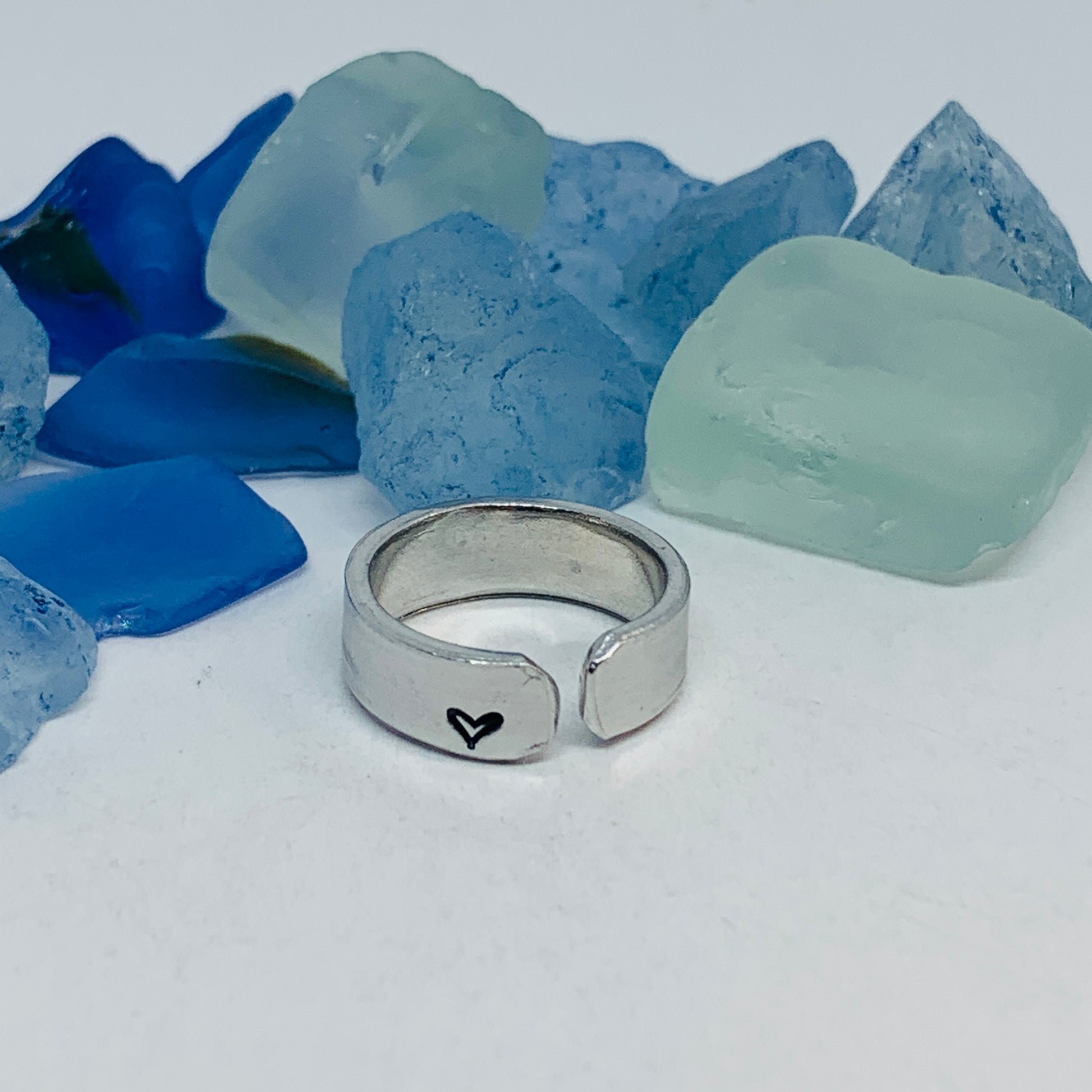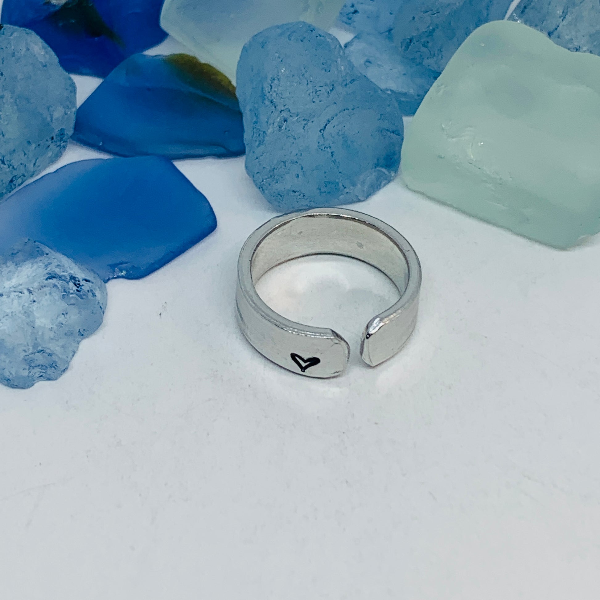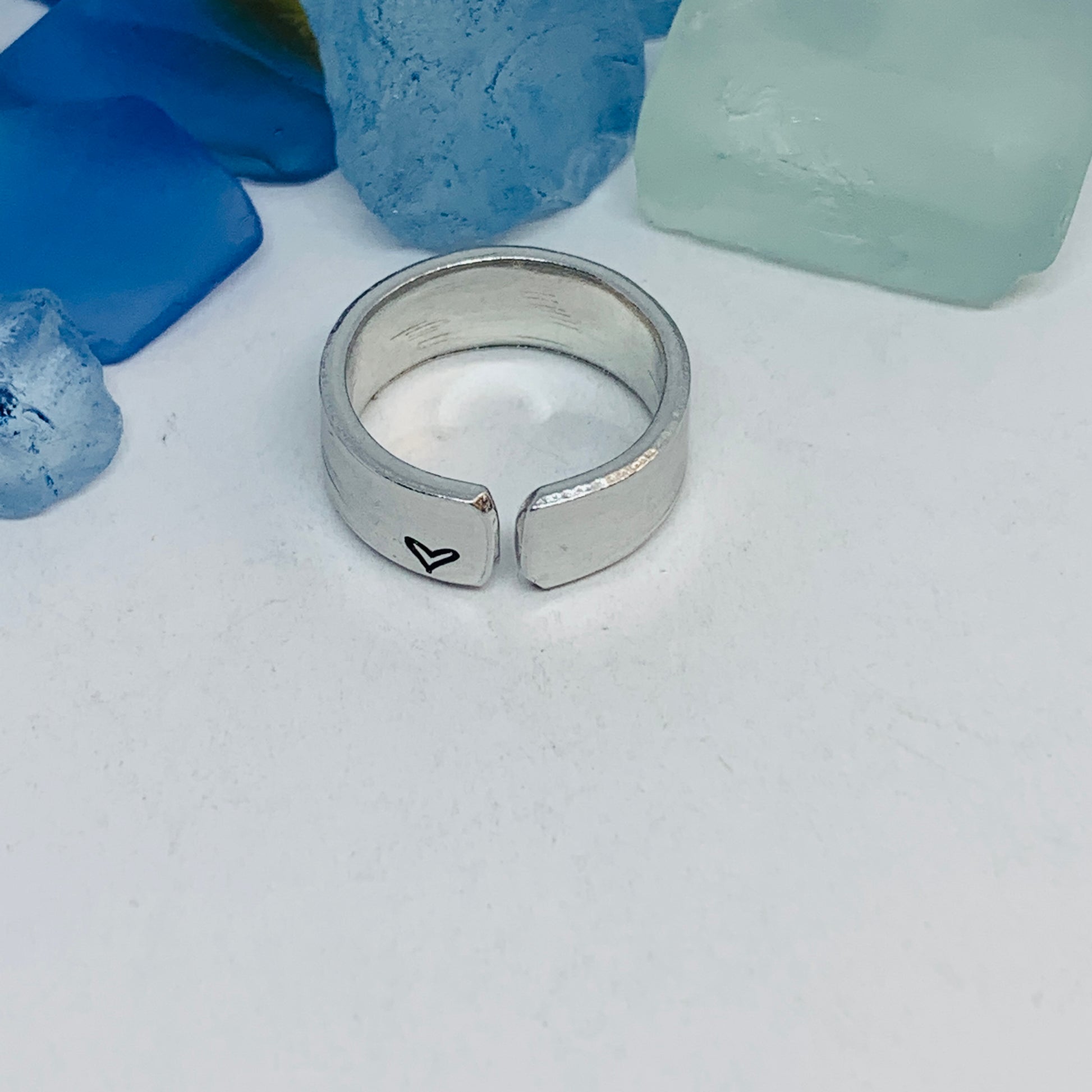 The hand stamped words “be you”, separated by a rainbow design, are featured front and center on this hand crafted ring with a small hand drawn heart design stamped on the far end - one outside, one in.
