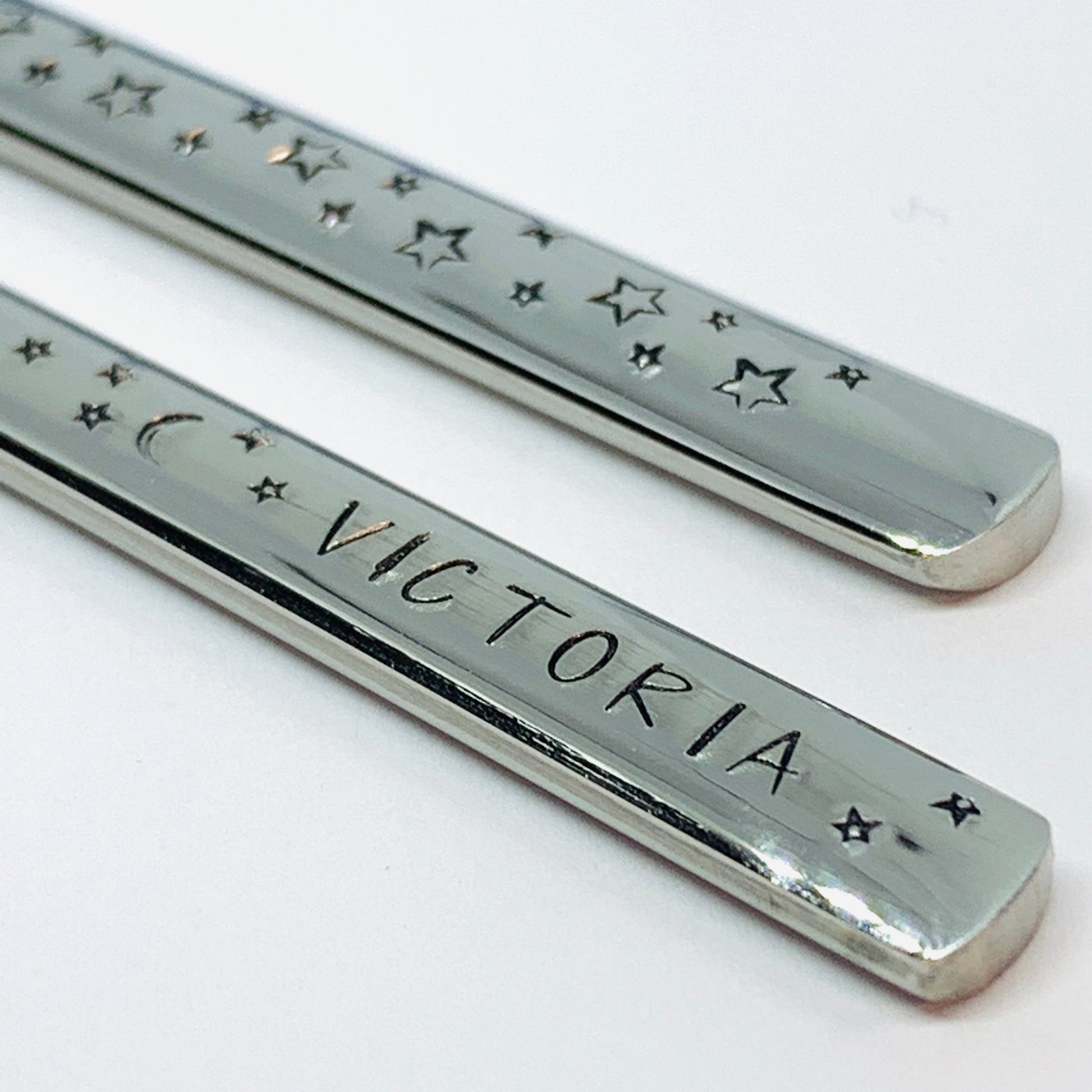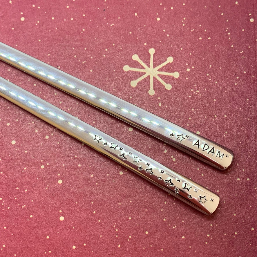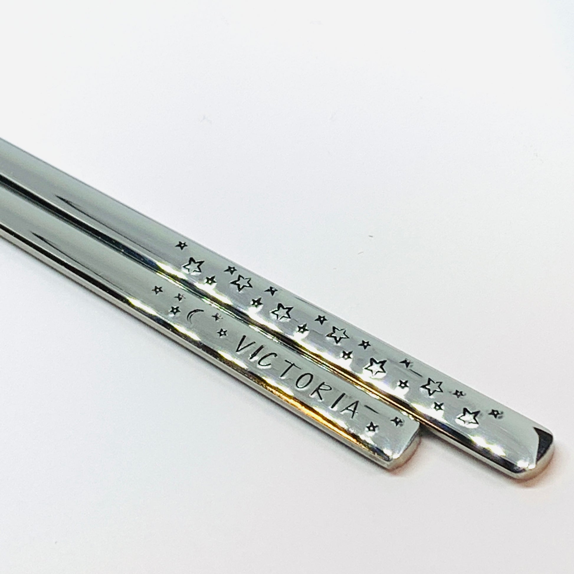 Set of two (2) stainless steel chopsticks. Personalize one with a name or word (limited to 8 characters) in the san serif font pictured and/or a few designs! Examples shown in the images. Due to the nature of the stainless steel chopstick, you may notice some slight imperfections. Also due to this nature, is the limitation to the amount and size of the design elements. Stars, moons, hearts and dots work well!