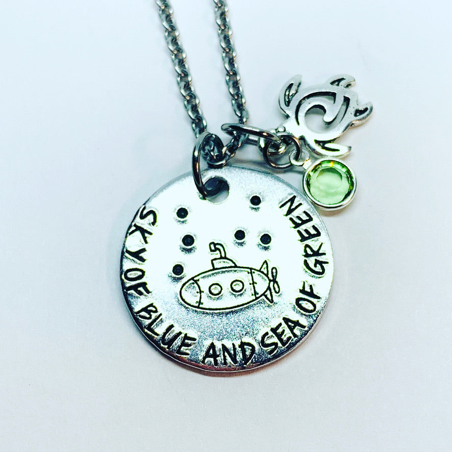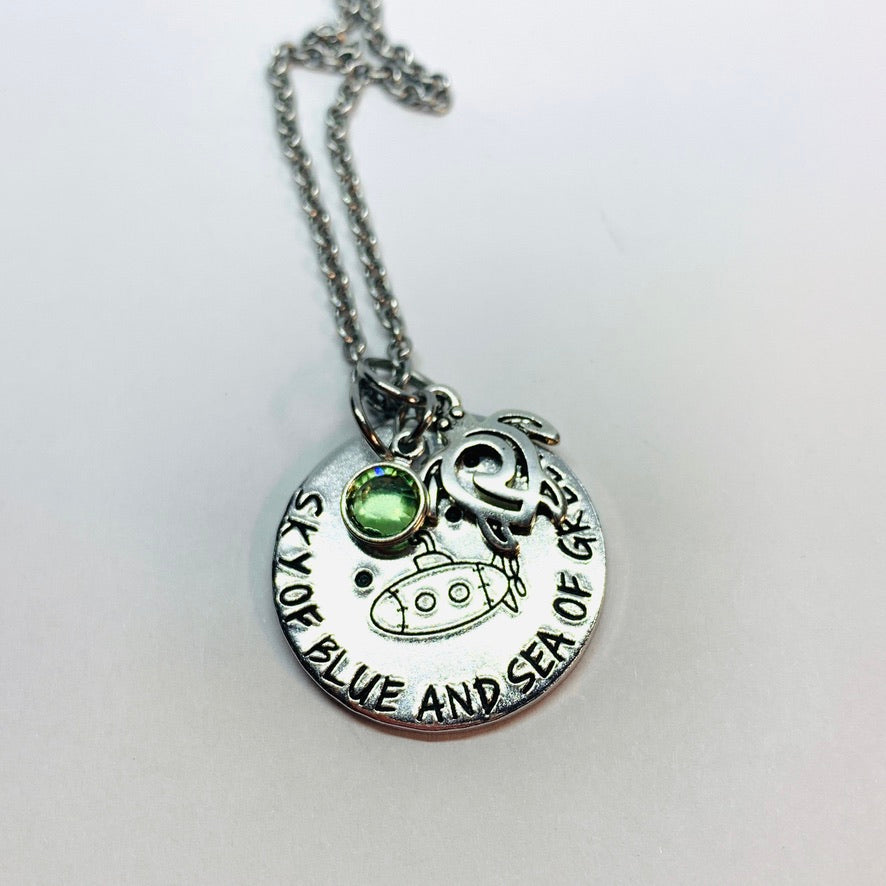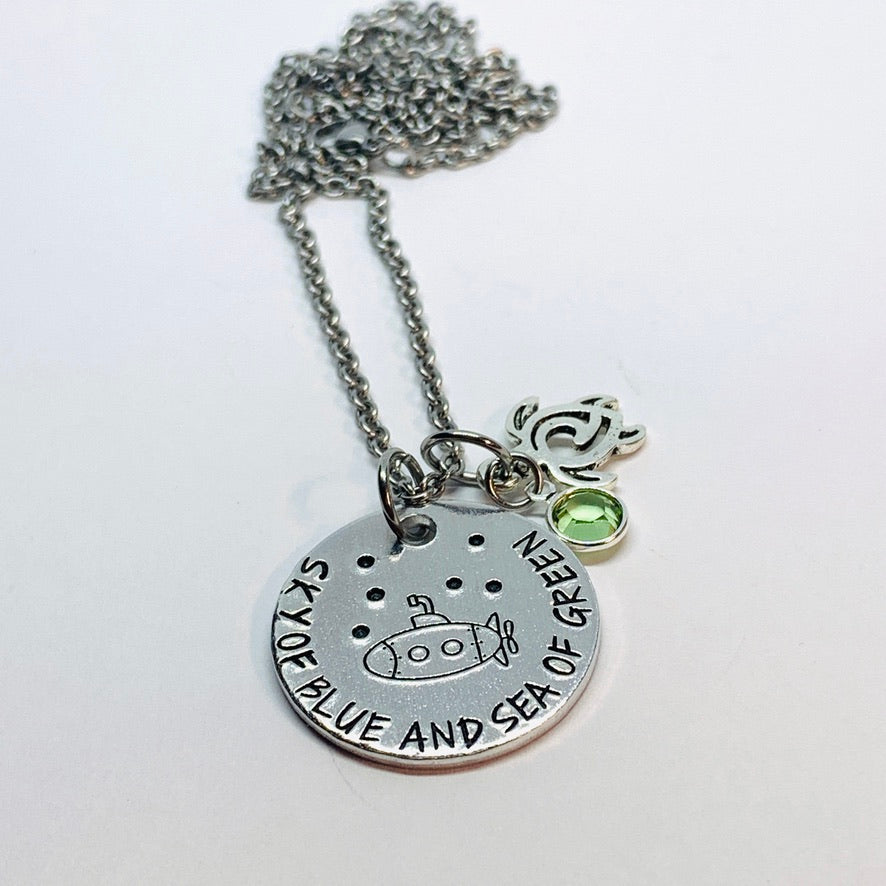 Attached on this piece is a Swarovski channel charm (August birth stone) - a nice (peridot) green to go along with the theme! Also on this piece is a cute little turtle charm. 18” Stainless steel chain.