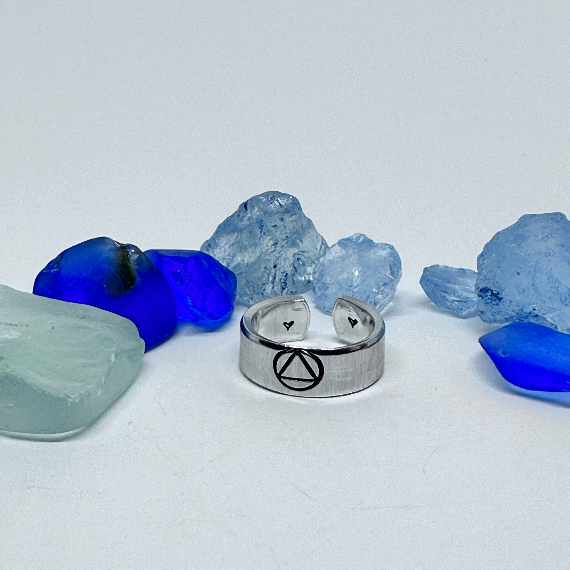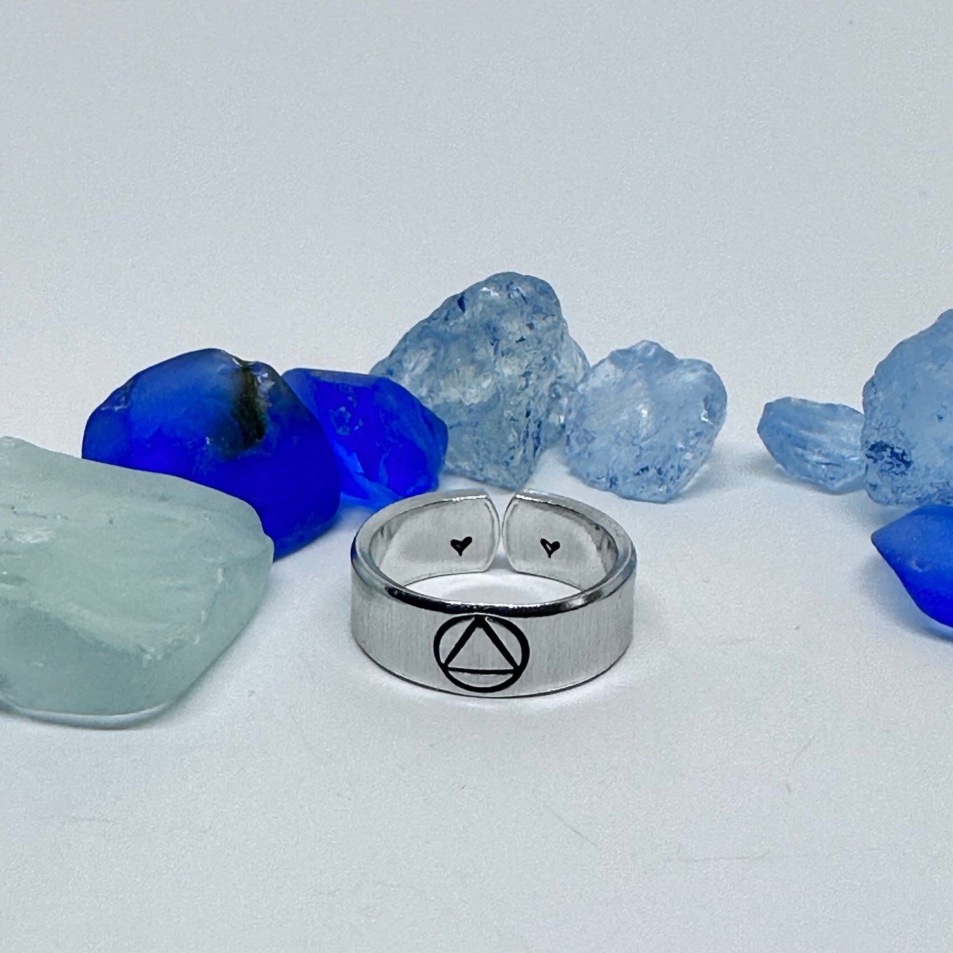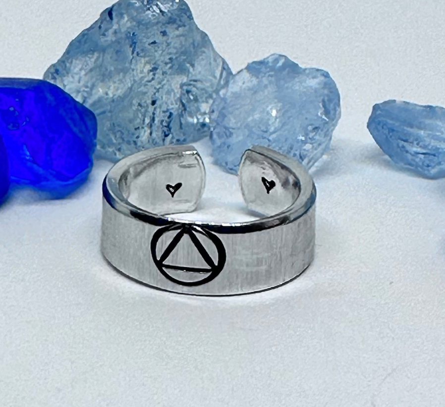 This adjustable 1/4" wide stacking ring features a hand stamped design of a sobriety symbol is the symbol used by Alcoholics Anonymous. The equilateral triangle represents the three part answer - unity, recovery and service - to a three part disease - physical, mental and spiritual, while the circle represents wholeness or oneness.