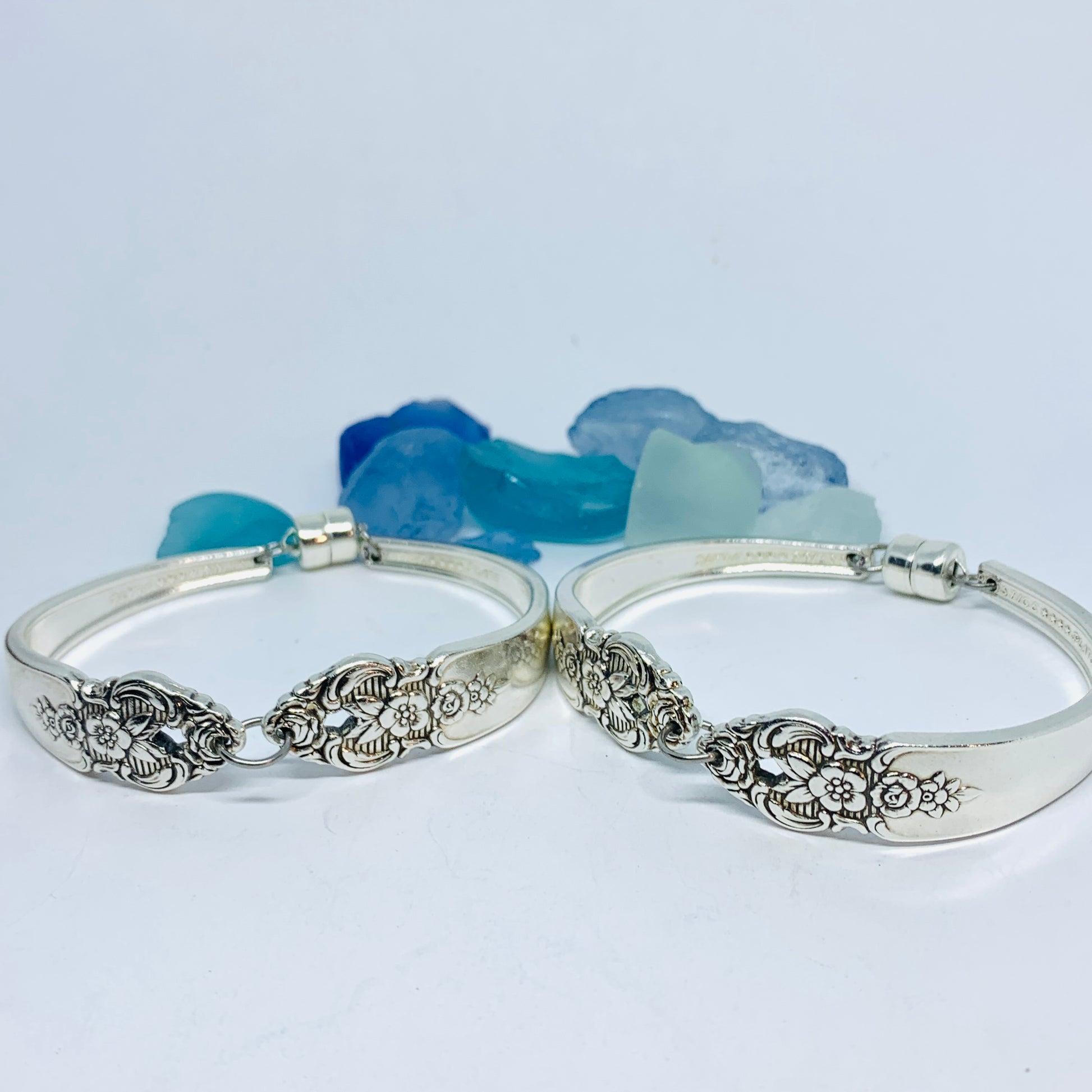 Bracelet created by hand by me from two vintage silver plated spoons known as “Distinction” introduced in 1951 by Oneida.