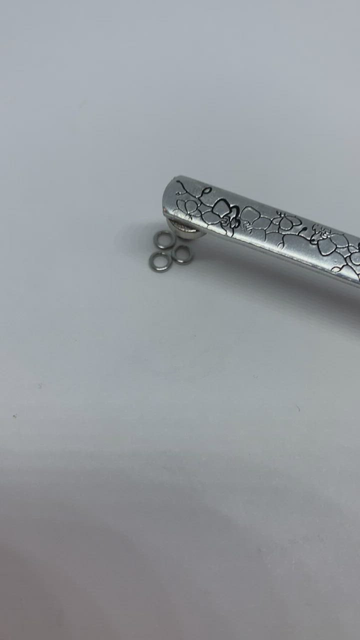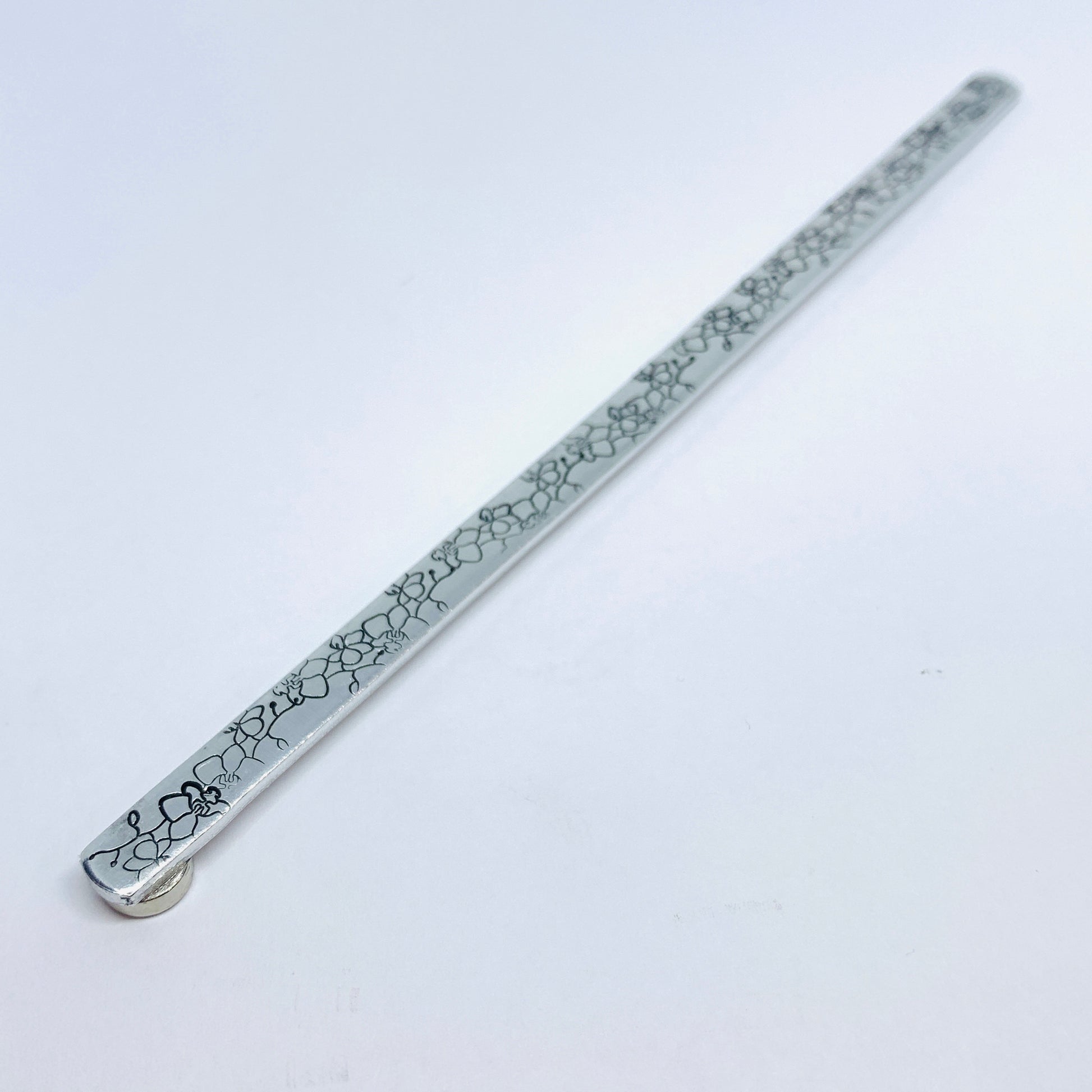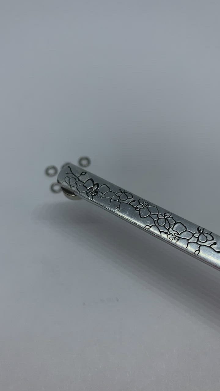 Beautifully stamped, this sample shows nicely detailed orchids along the handle. On one end on the other side is the strongest magnet you can find out there!