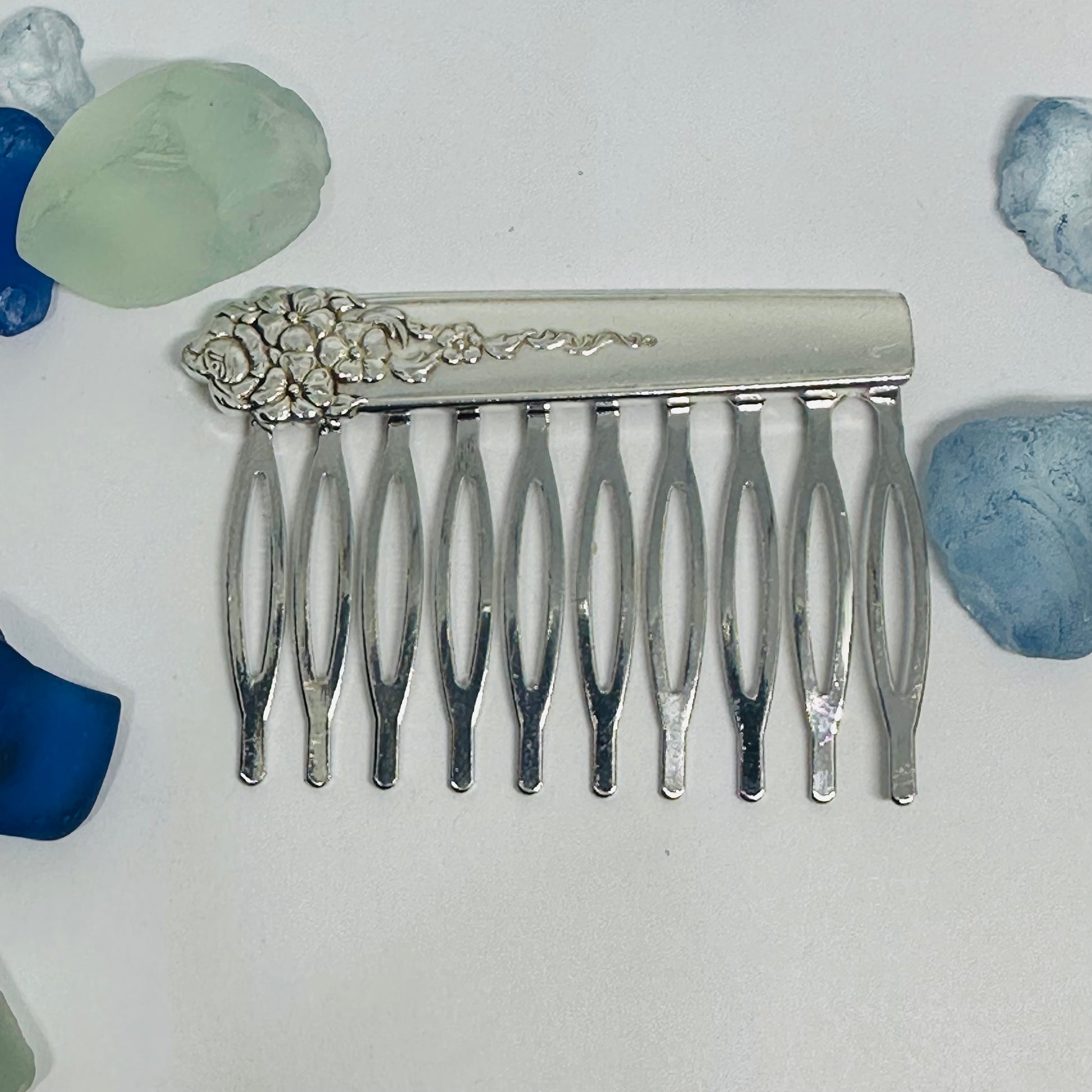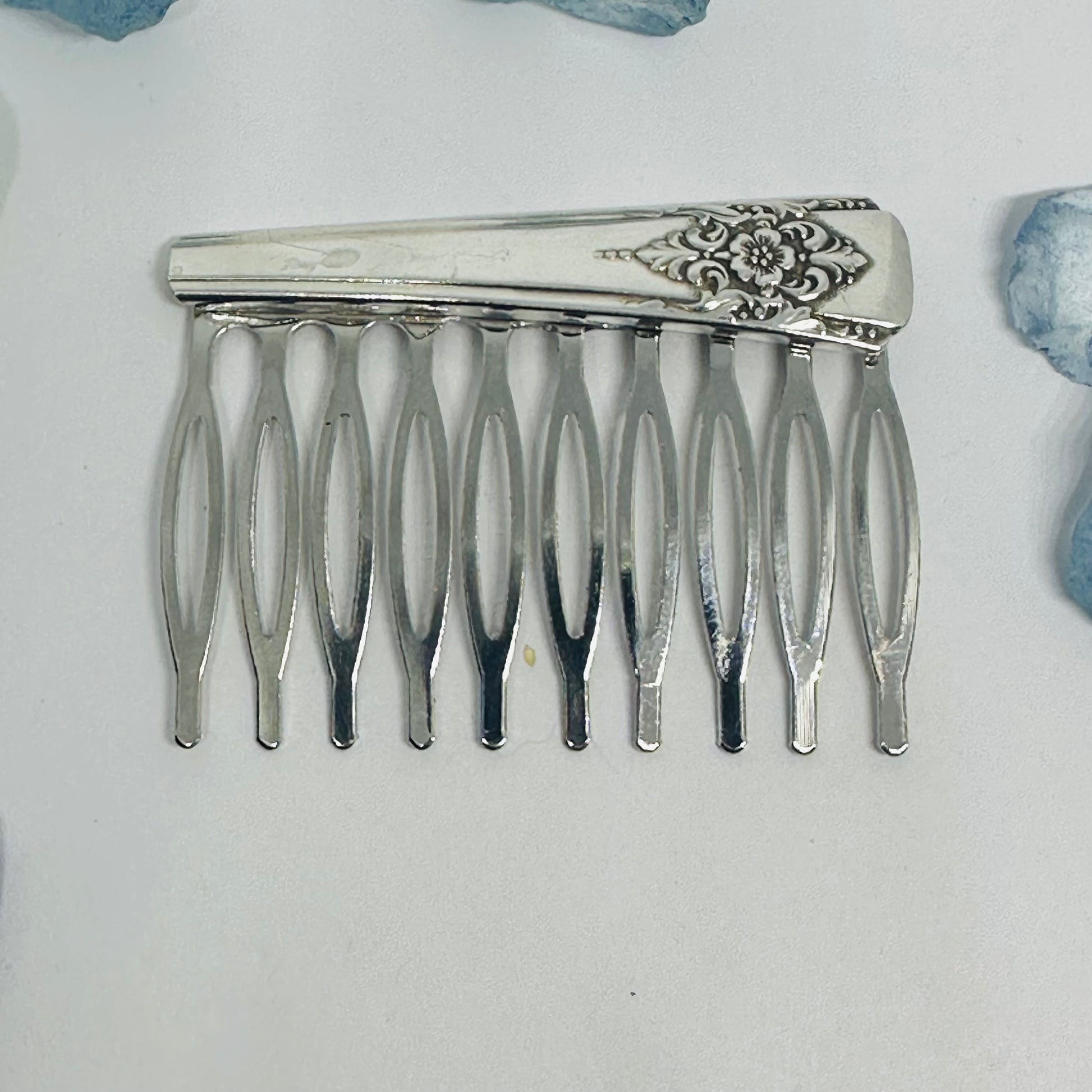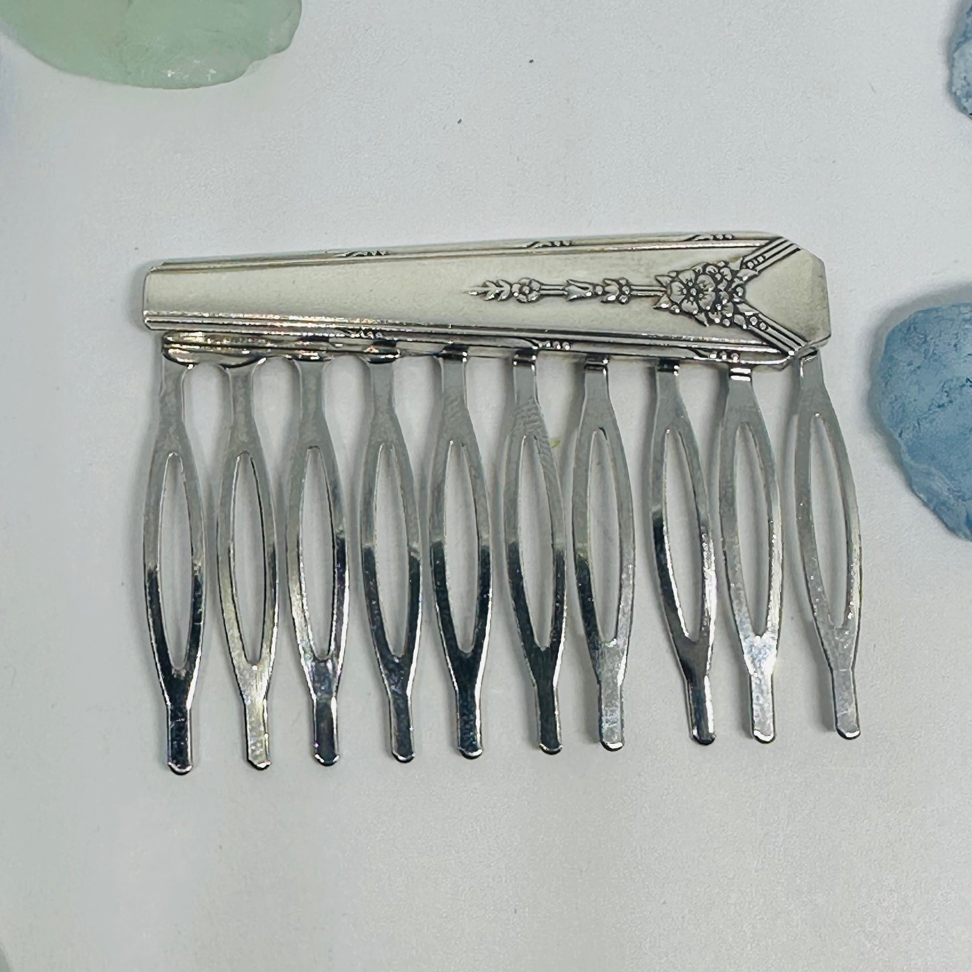 Elevate your hairstyle with a touch of timeless elegance. This one-of-a-kind hair comb is handcrafted from a piece of genuine vintage silverware, preserving the beauty and history of a bygone era. We meticulously select each antique silverware handle for its unique pattern and character, then carefully transform it into a stunning and functional hair accessory.