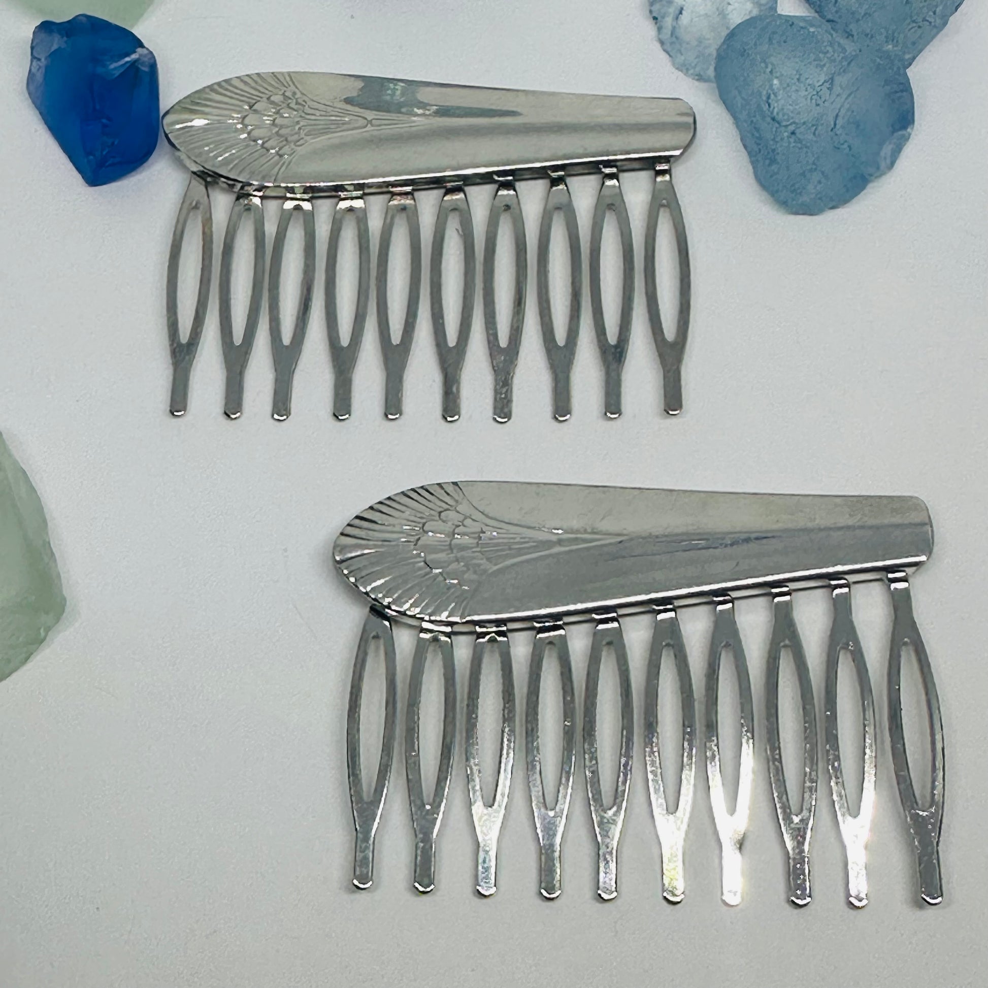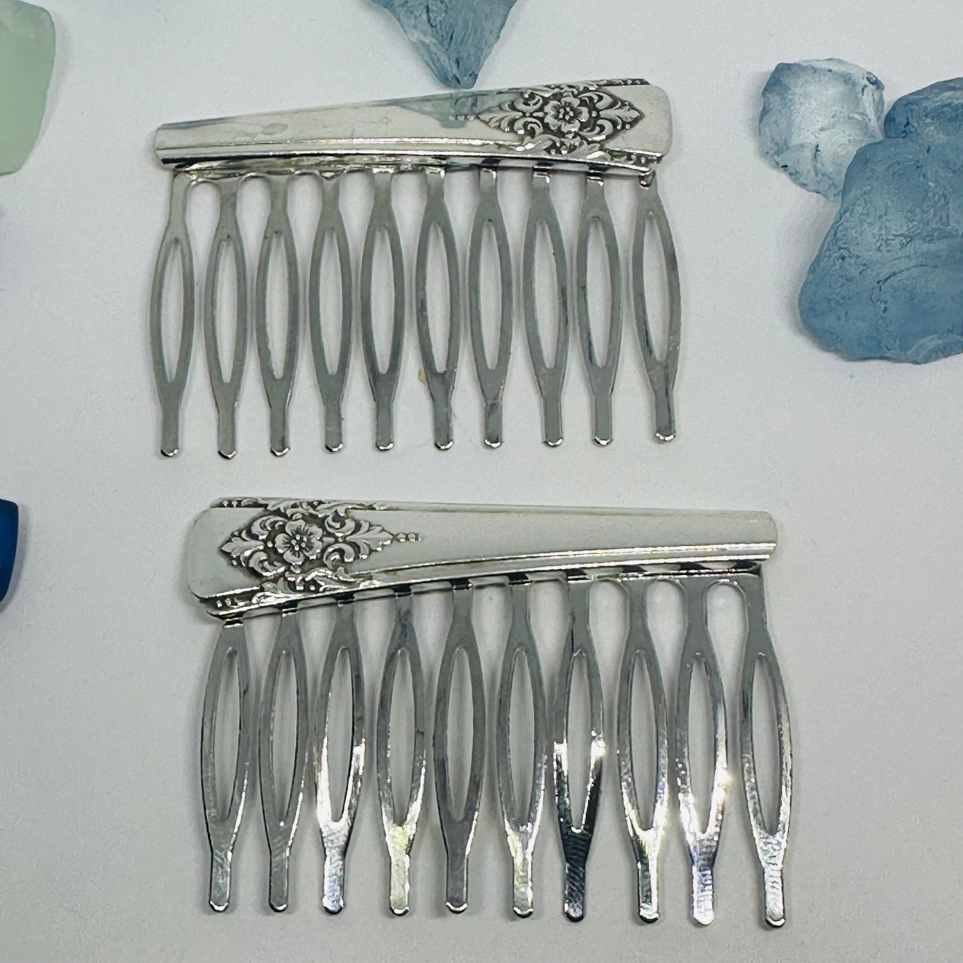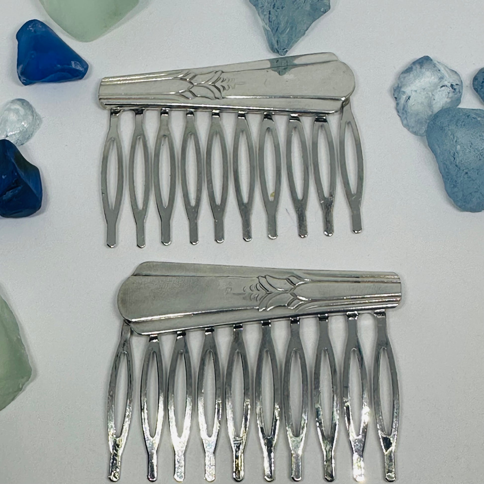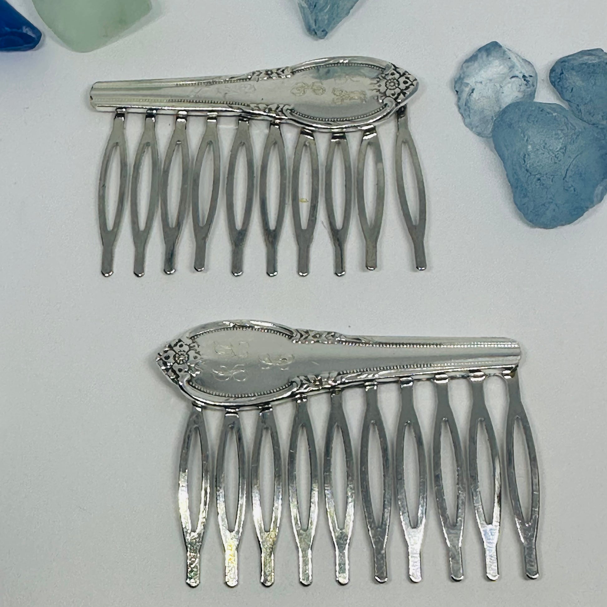 Materials: Repurposed vintage silver plate silverware, silver metal hair side combs.
