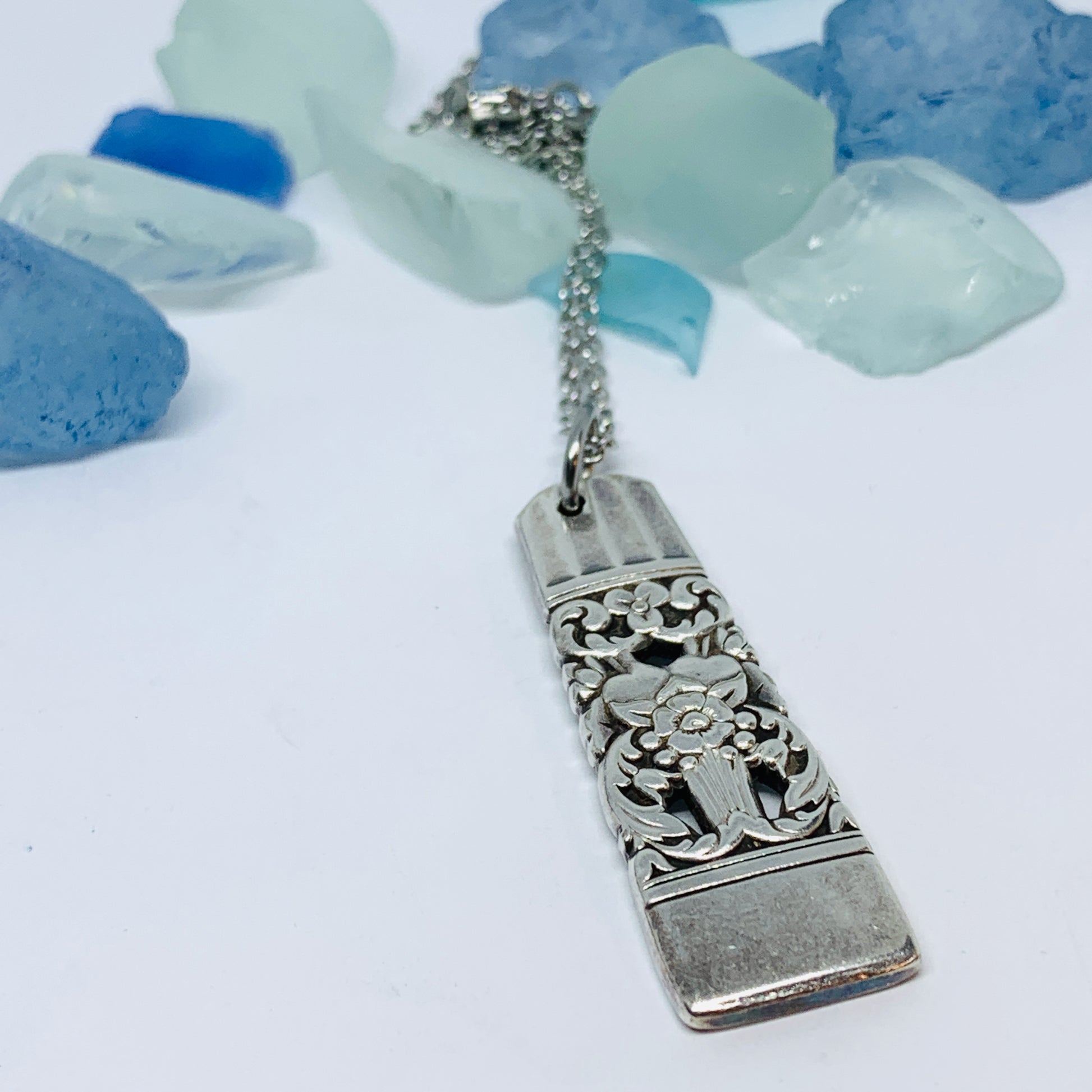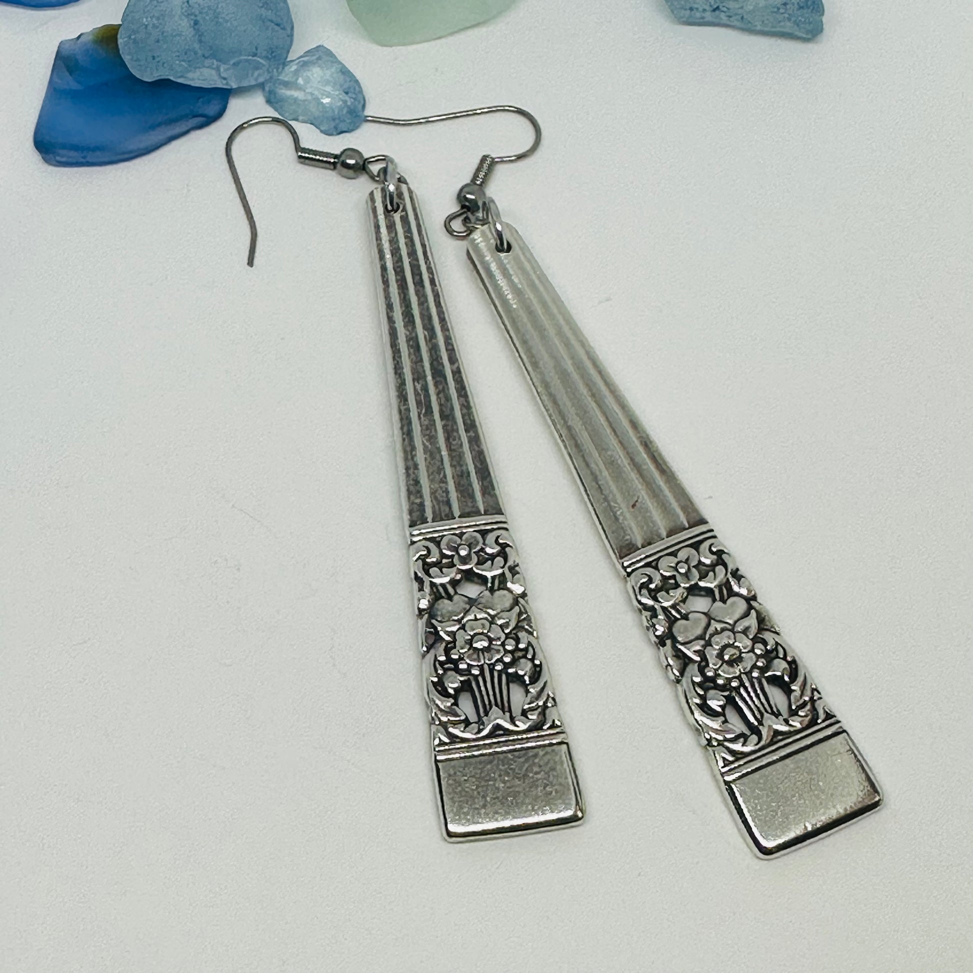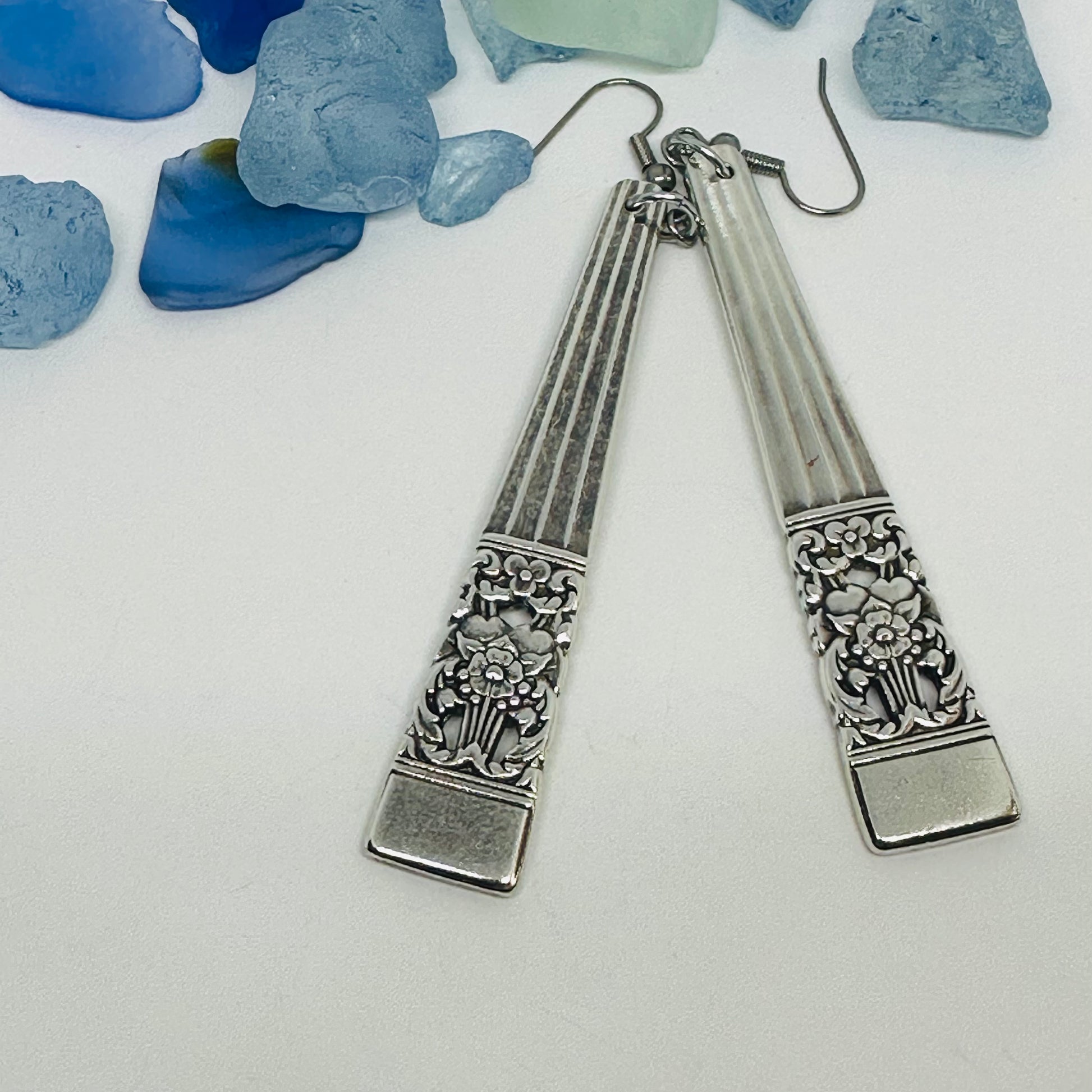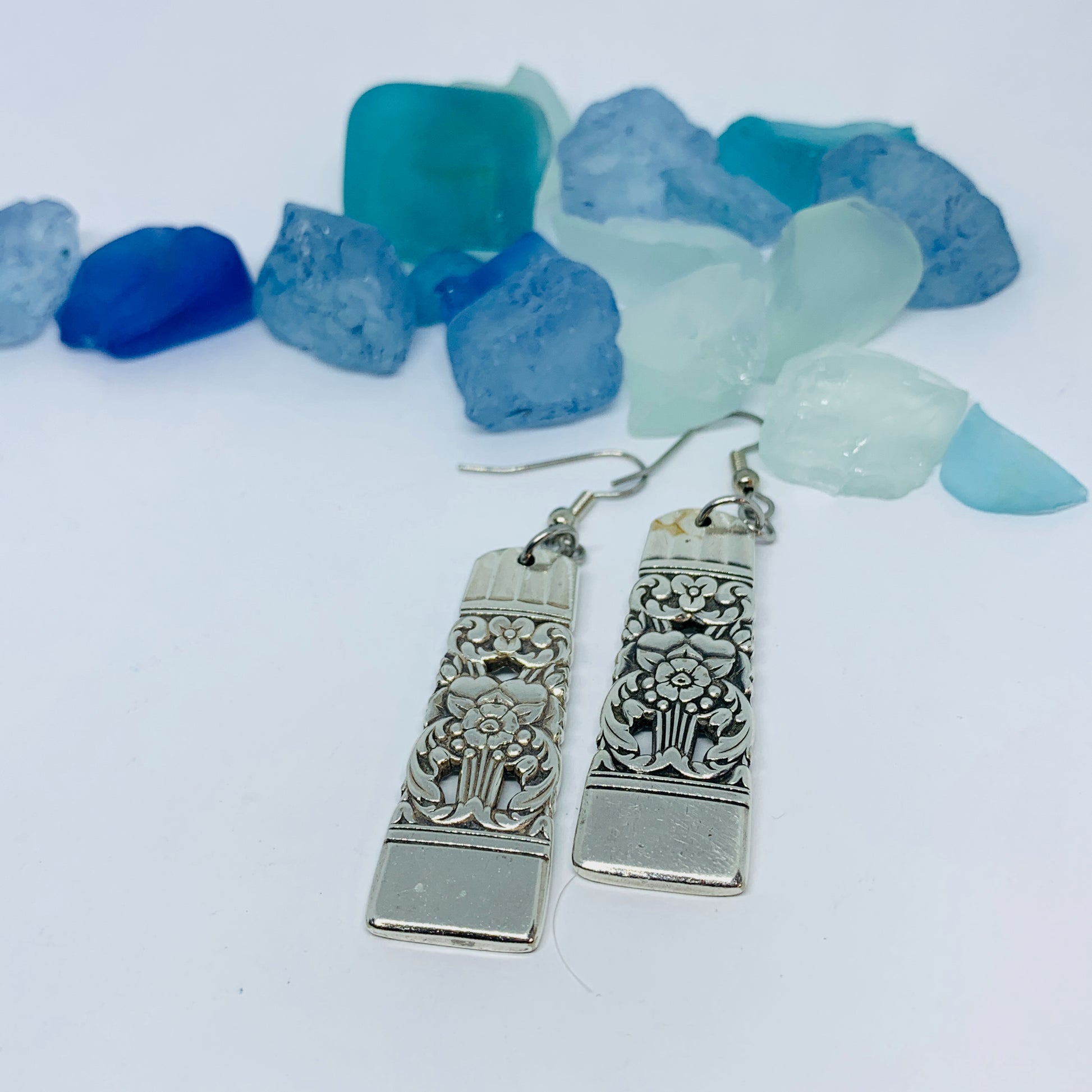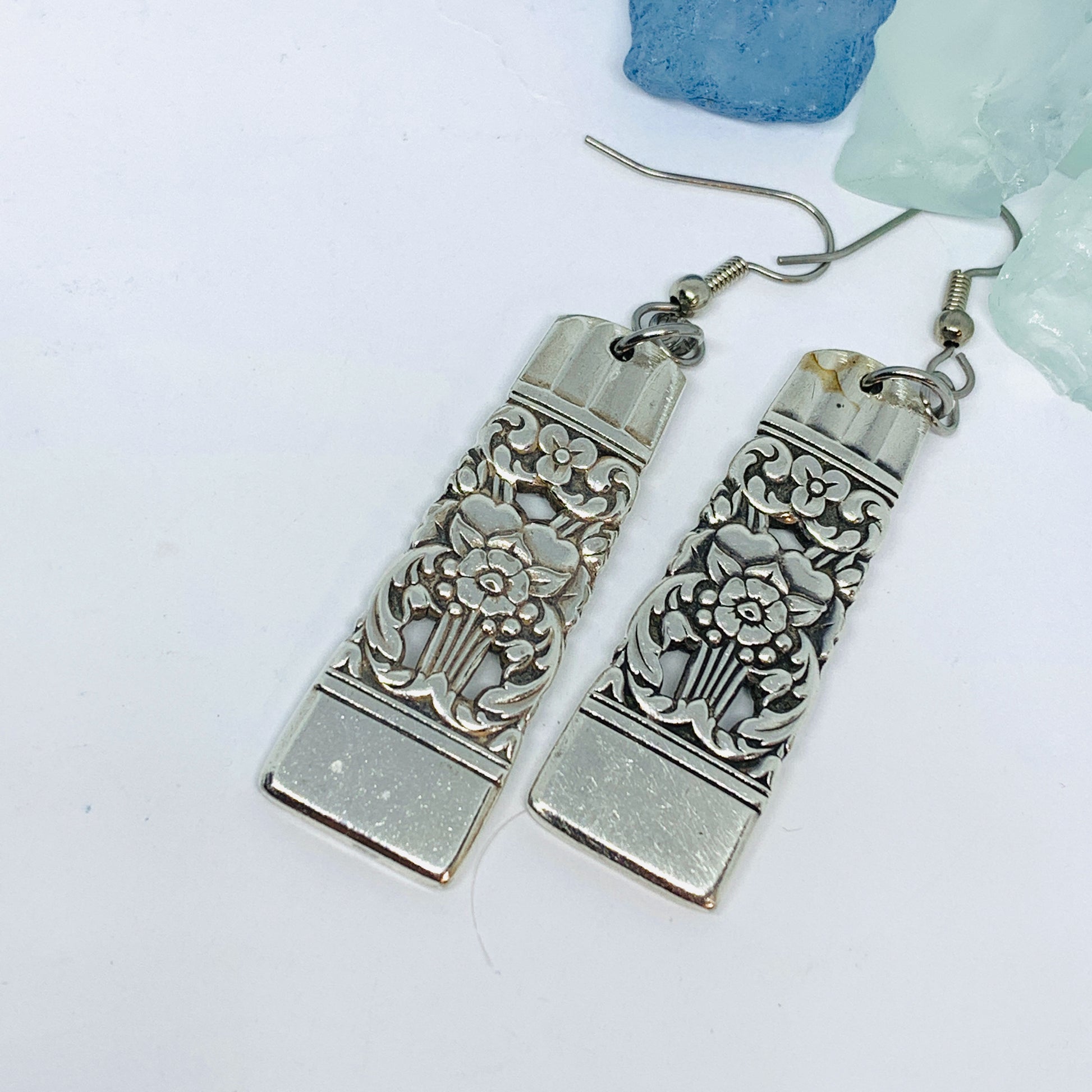 These decorative earrings were made from vintage silverware spoon handles - Coronation Community Plate. They are attached to sterling silver ear wires. They come with clear earring backs to prevent loss! Look for the matching necklace in my shop!