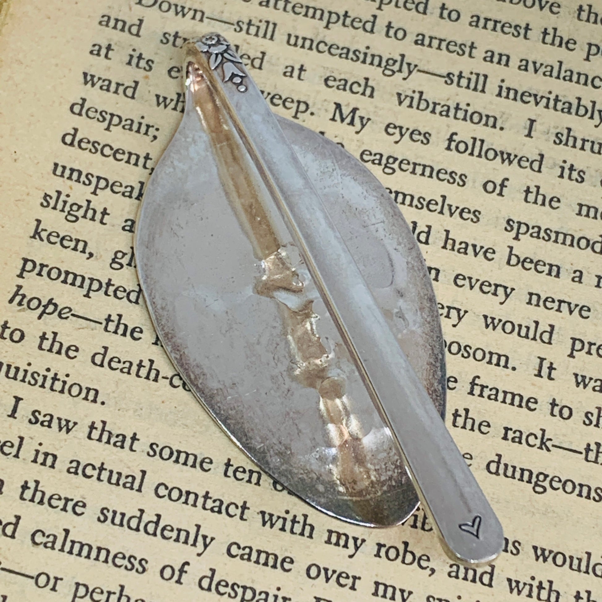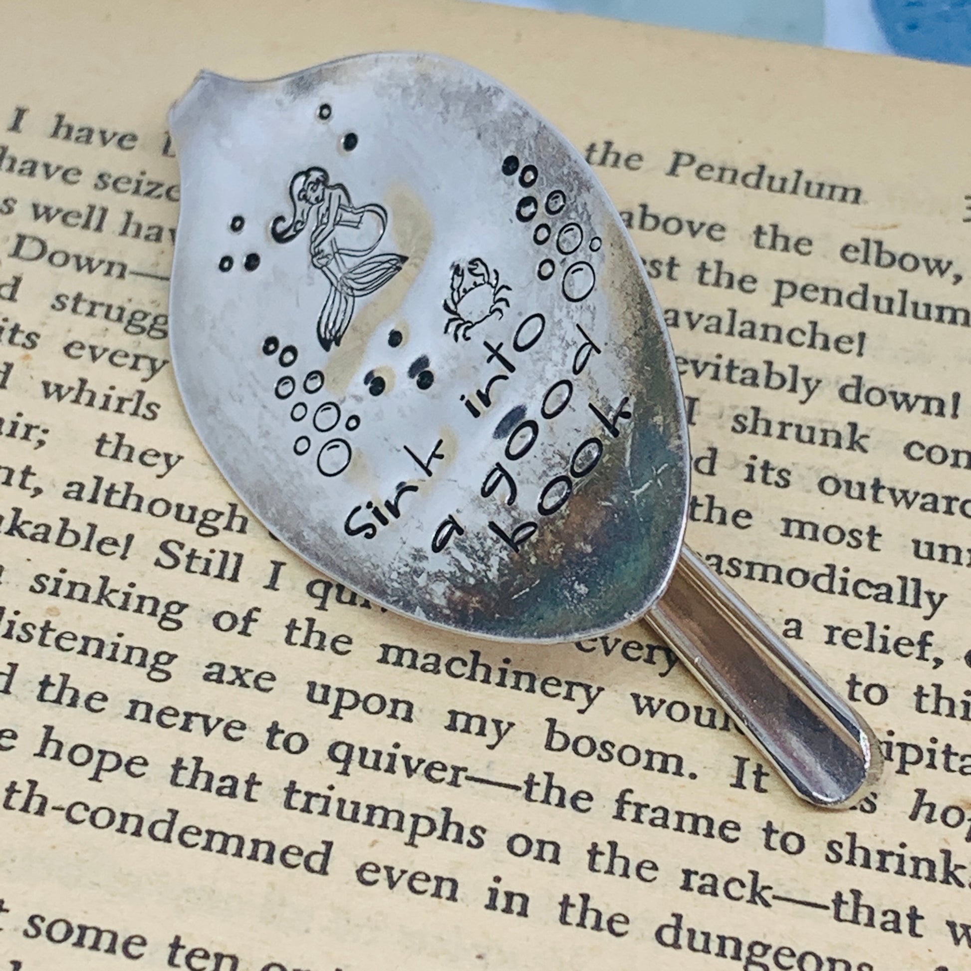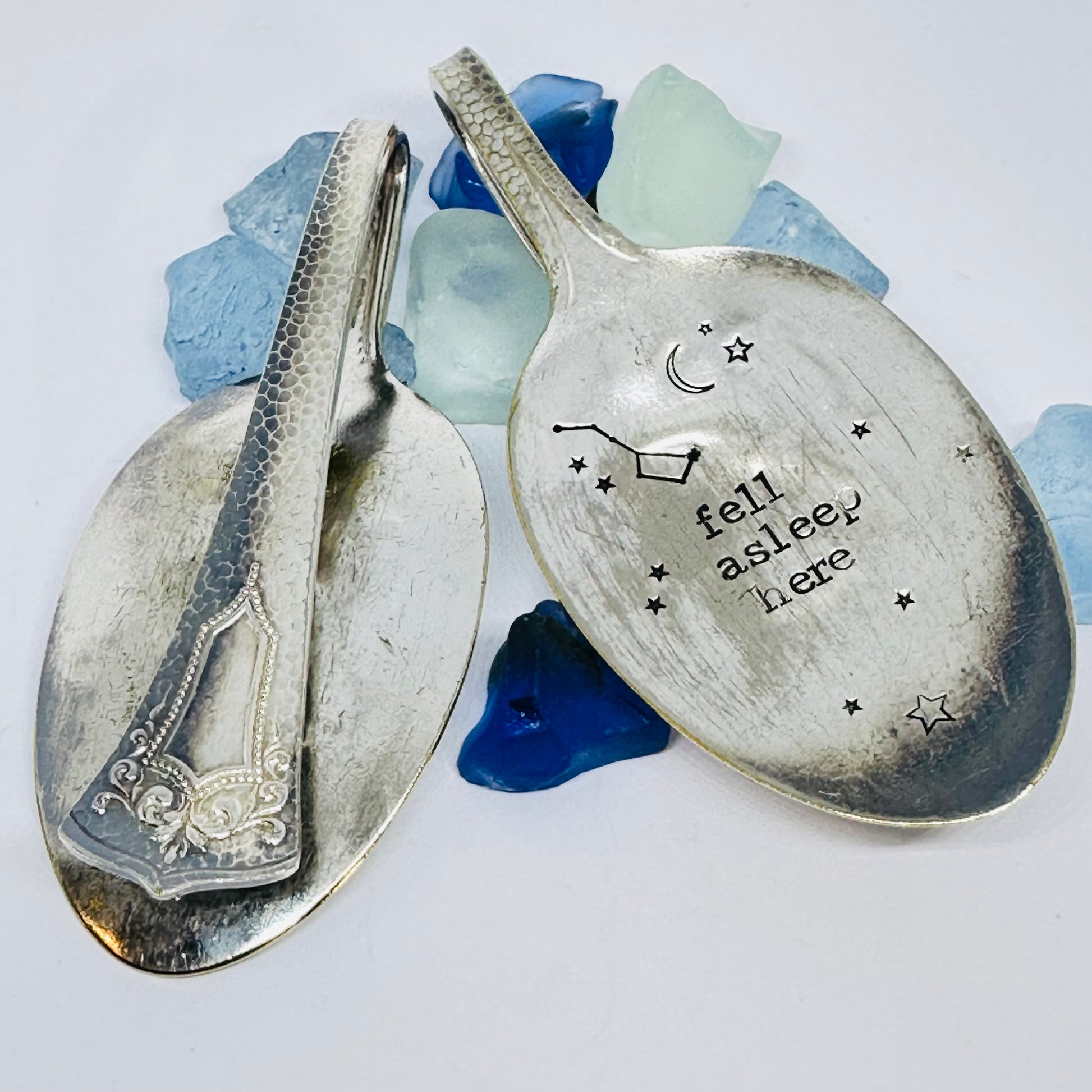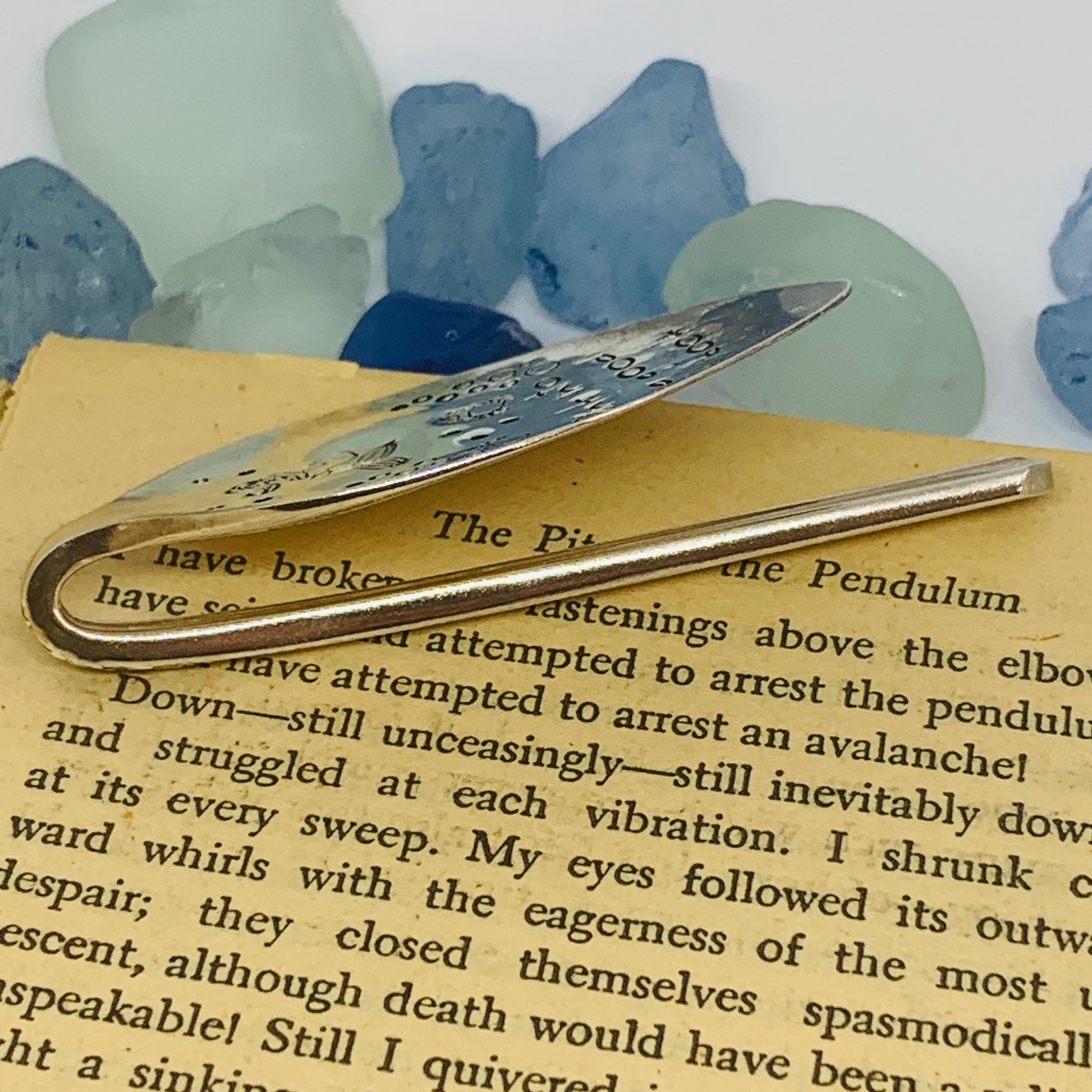 Vintage silverware spoon bookmark features hand stamped sayings. A great way to encourage reading for kids of all ages! Being vintage in nature you will see signs of wear on all of these pieces. I think it just adds to the charm! Allow me to choose from the patterns I have on hand. You choose the saying! Each will vary slightly from the images here.