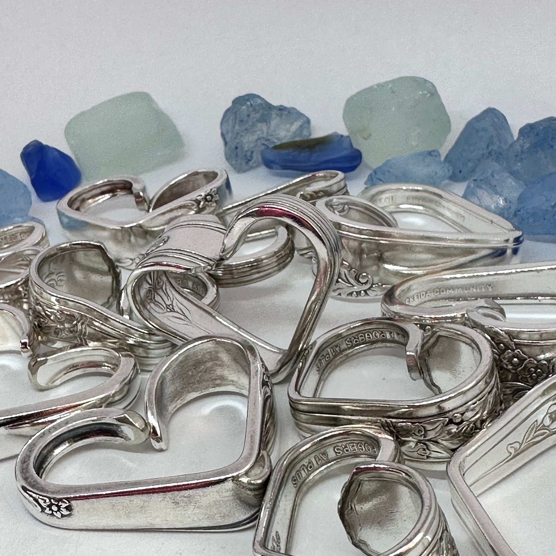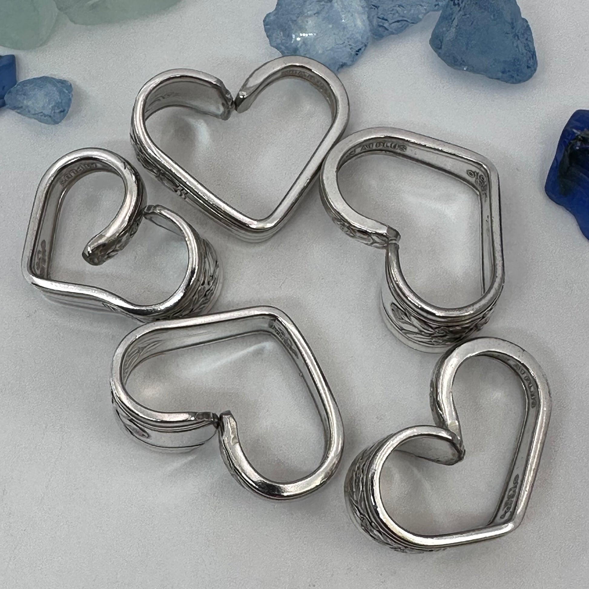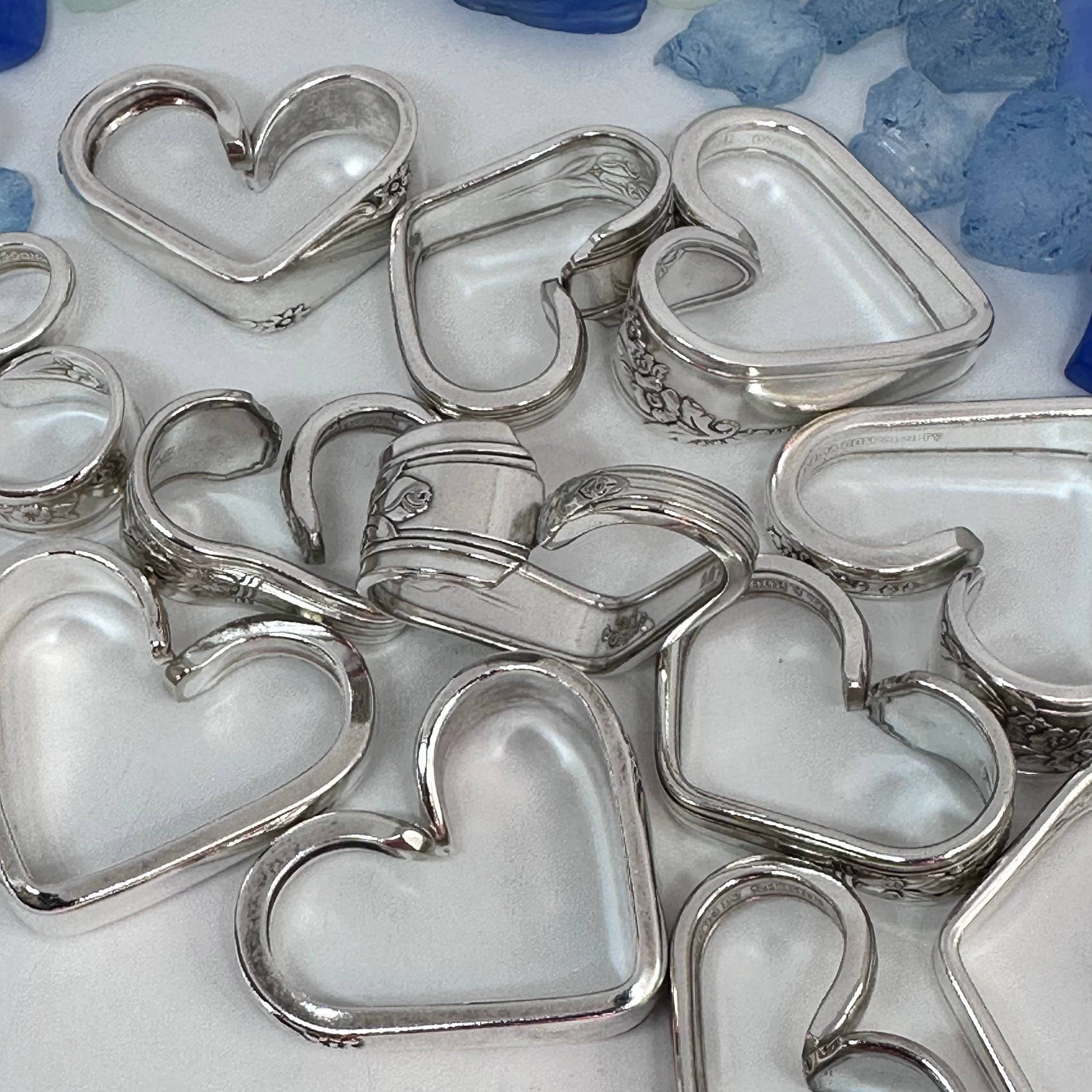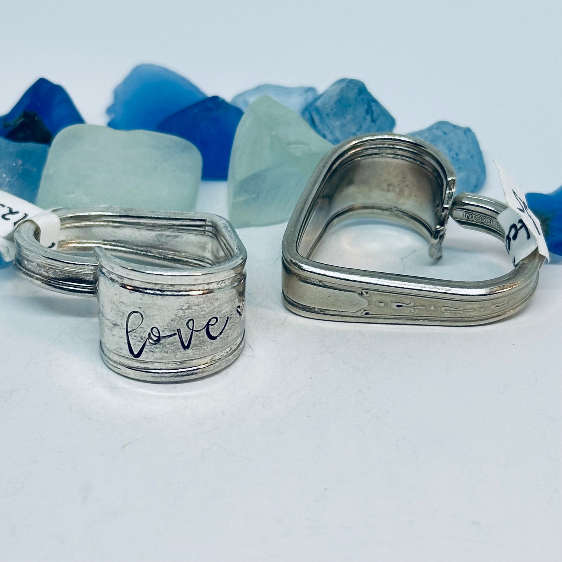 Vintage silverware spoon handles bent into heart shapes. Allow me to choose from the silverware patterns I have on hand. Each will be a one of a kind! Some with more “character” or are a bit more “unique” than others. If you have a preference, please let me know via message or a note at checkout - one that’s more “perfect” - or one that has more character, and might be a little irregular.