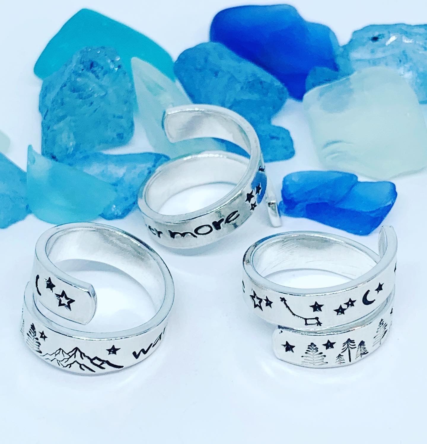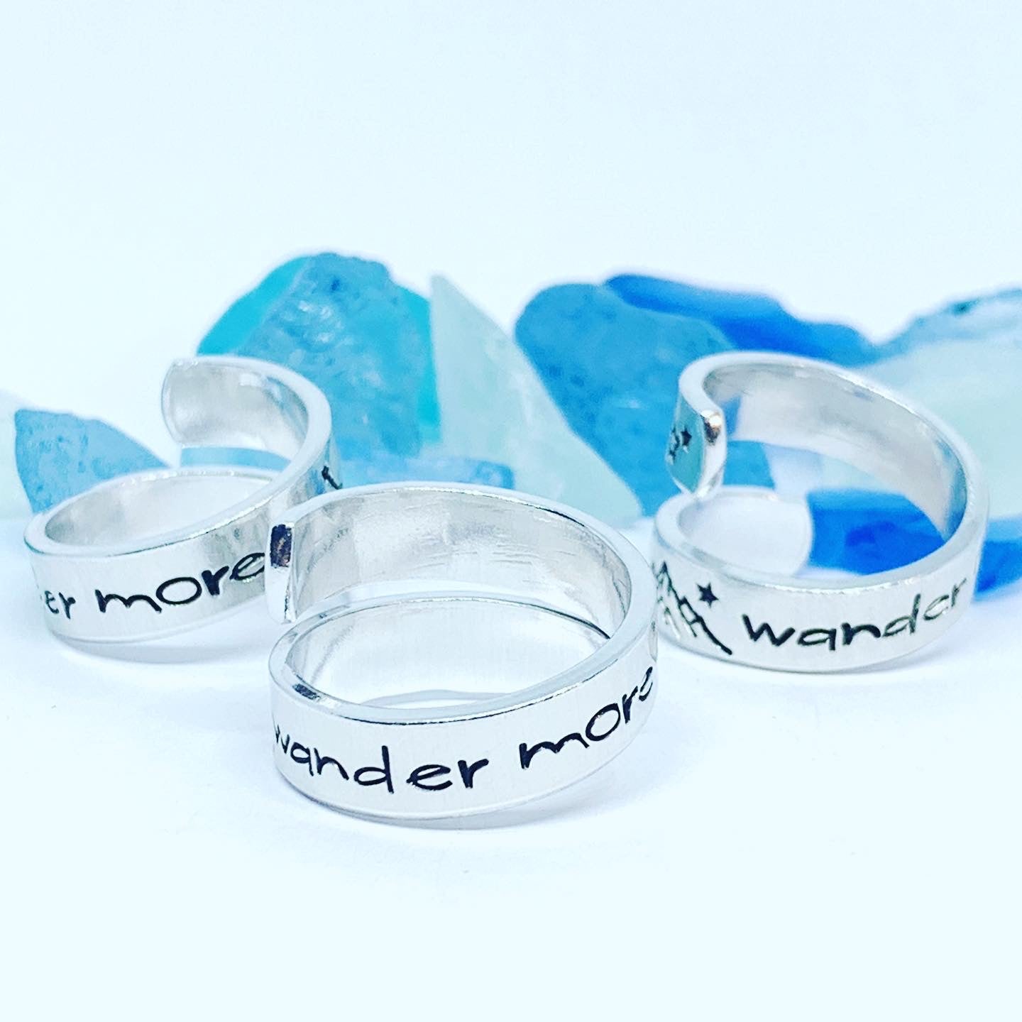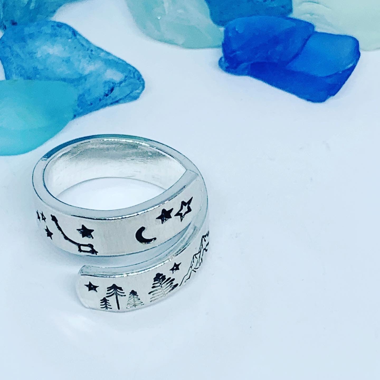 Pine trees, mountains, moon, stars, sunrise/sunset, and the words “WANDER MORE” adorn this hand crafted wrap ring.