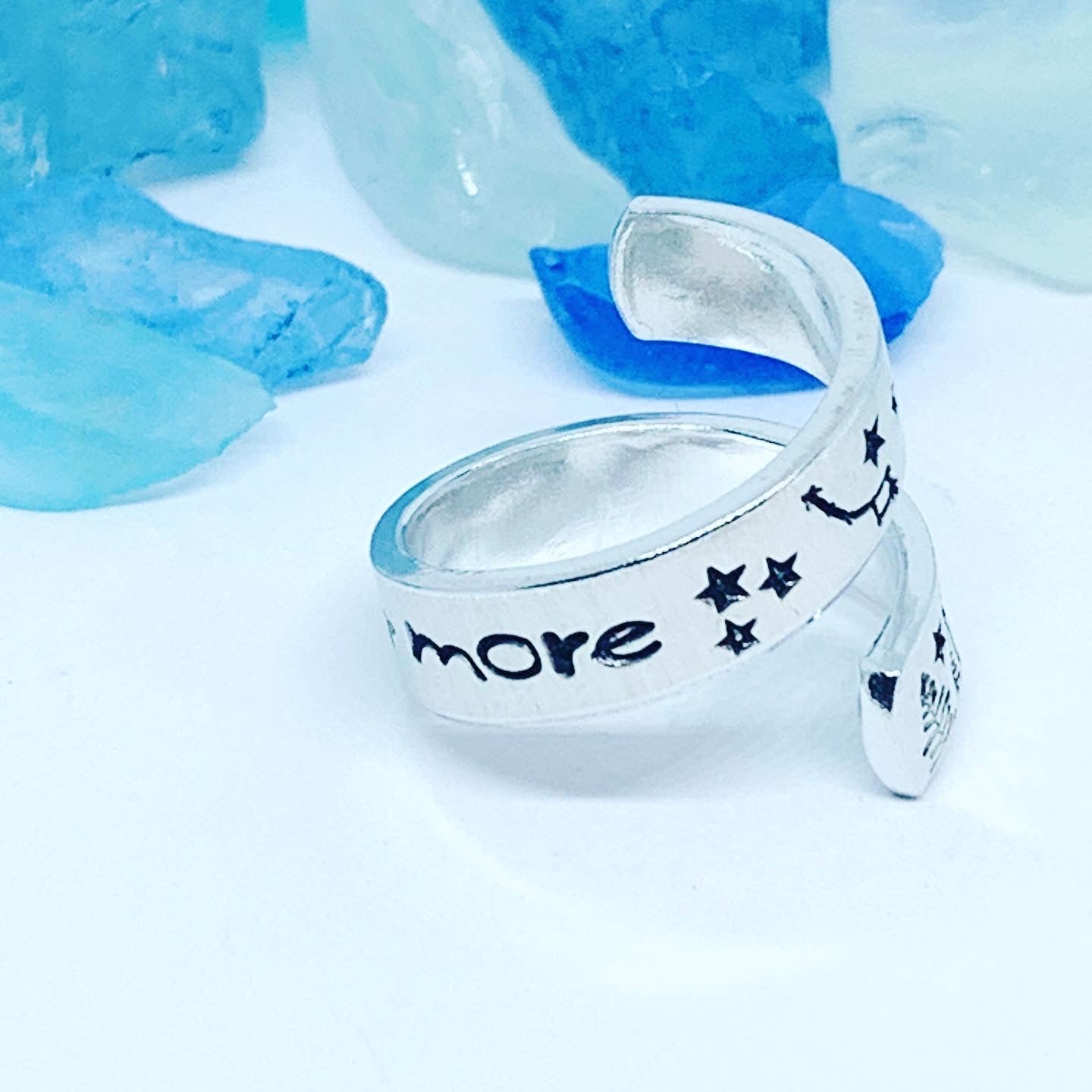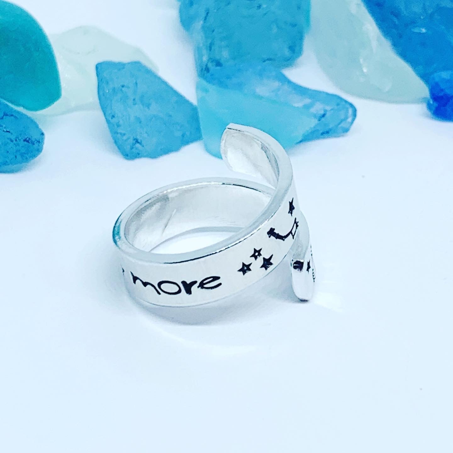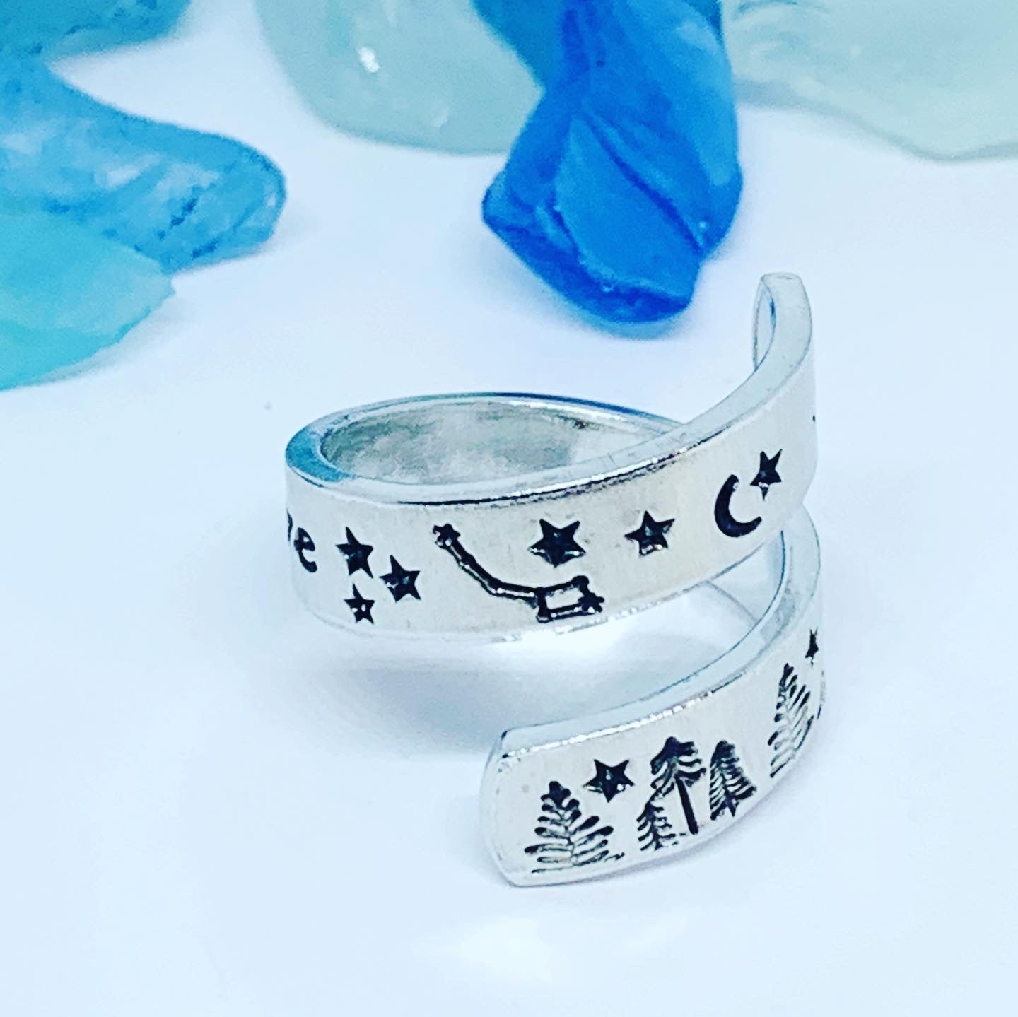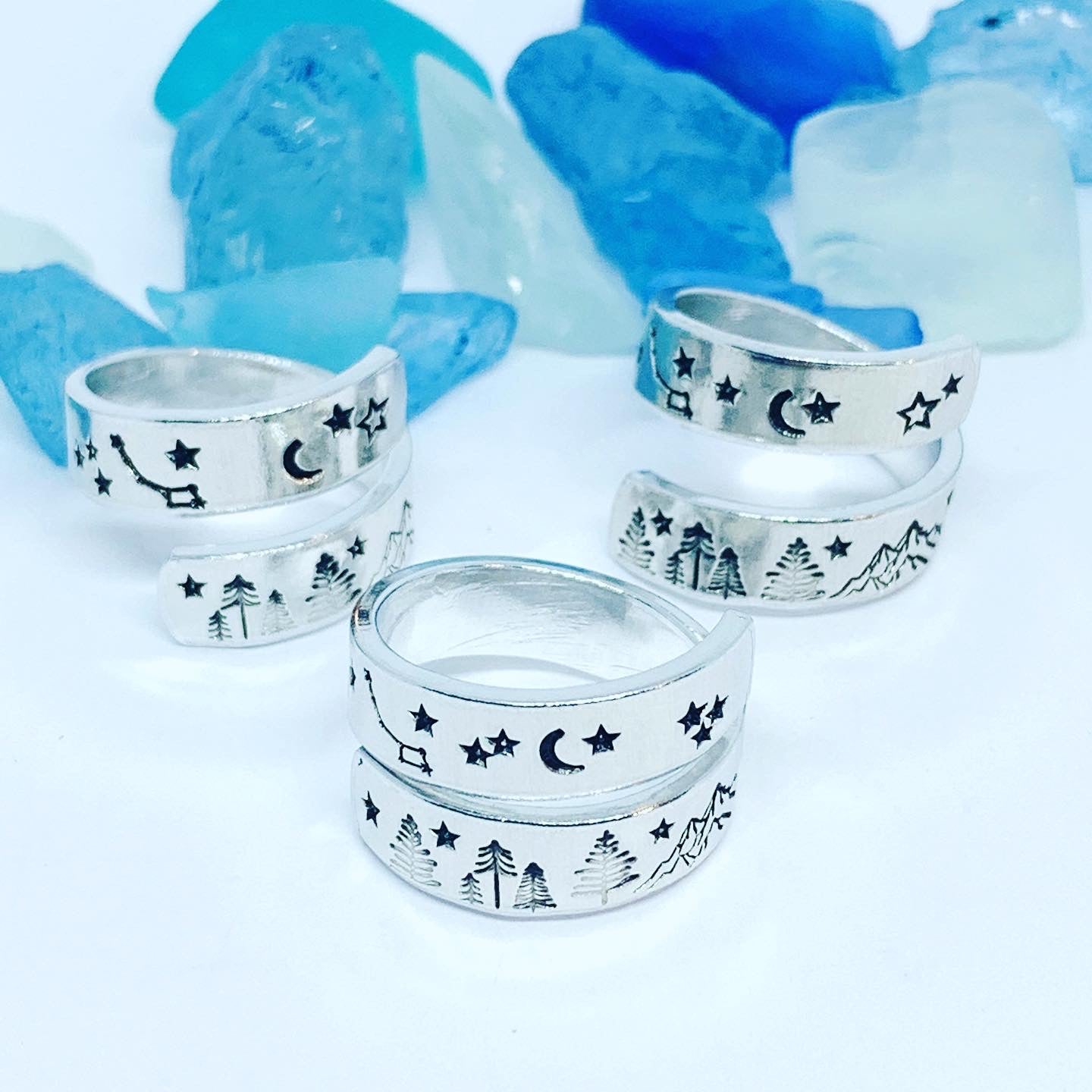 Pine trees, mountains, moon, stars, sunrise/sunset, and the words “WANDER MORE” adorn this hand crafted wrap ring.
