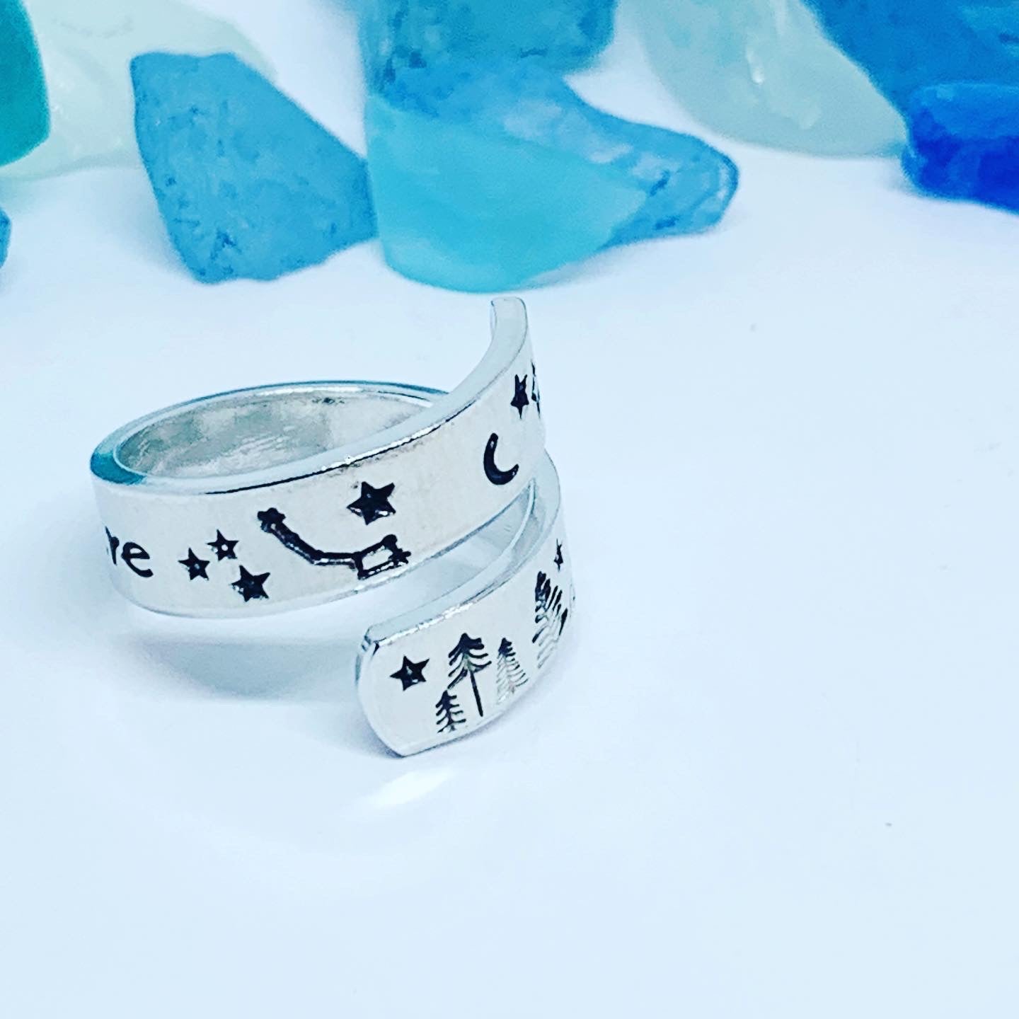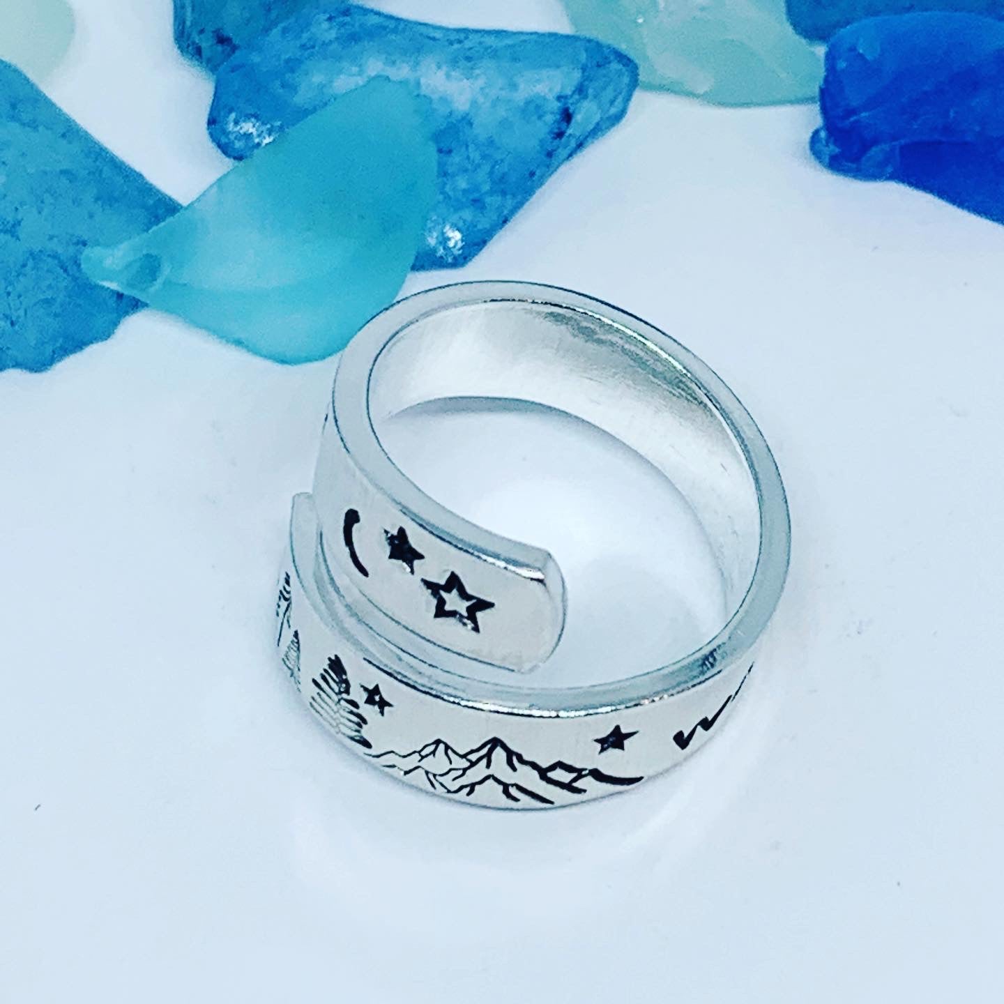 Wander More Hand Stamped Wrap Ring | Nature Lover | Outdoorsy Hiker | Gift for Her | Mountain Wrap Ring | Valentine’s Gift | Trees Mountains