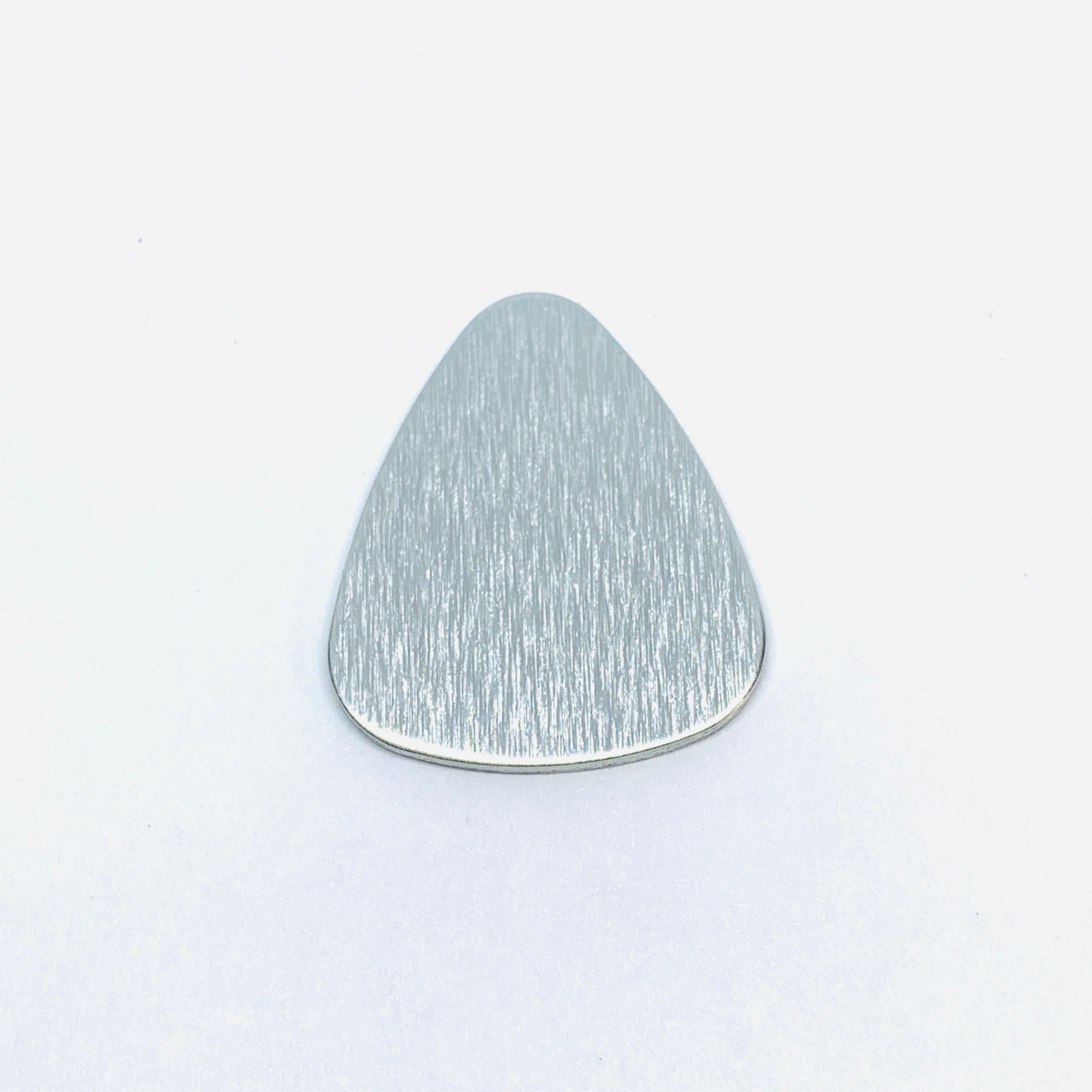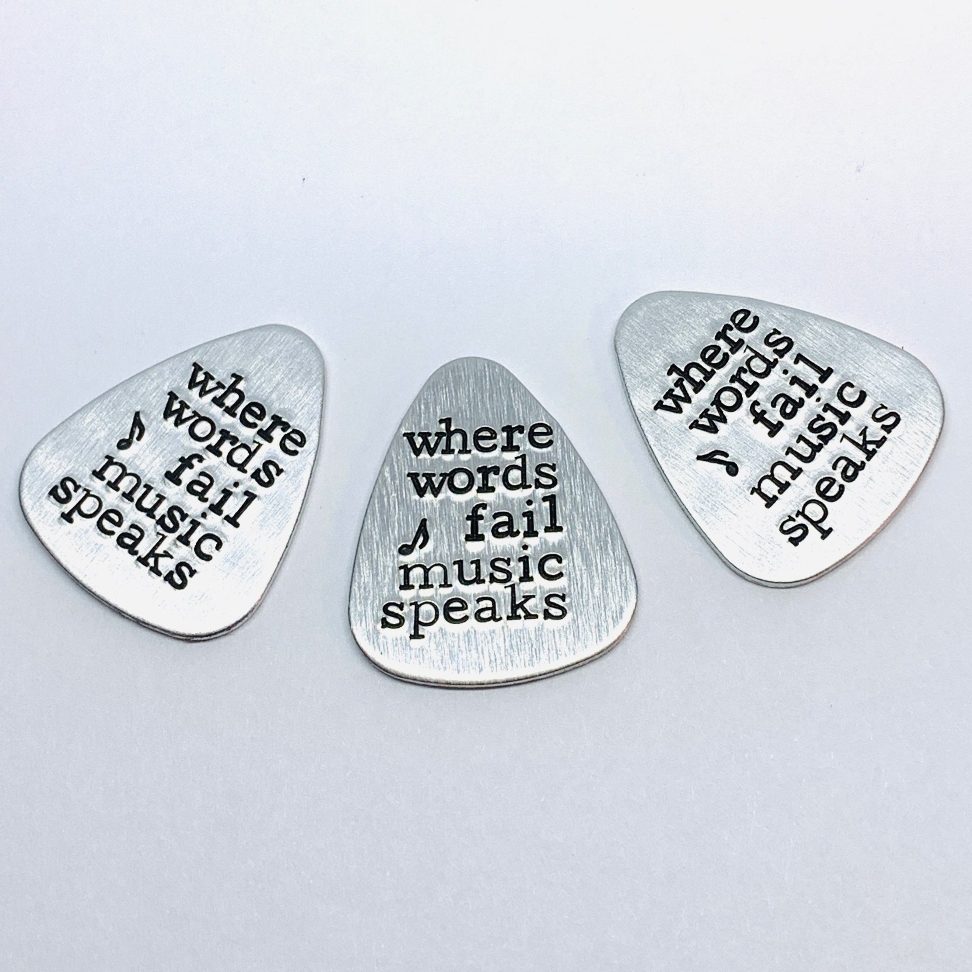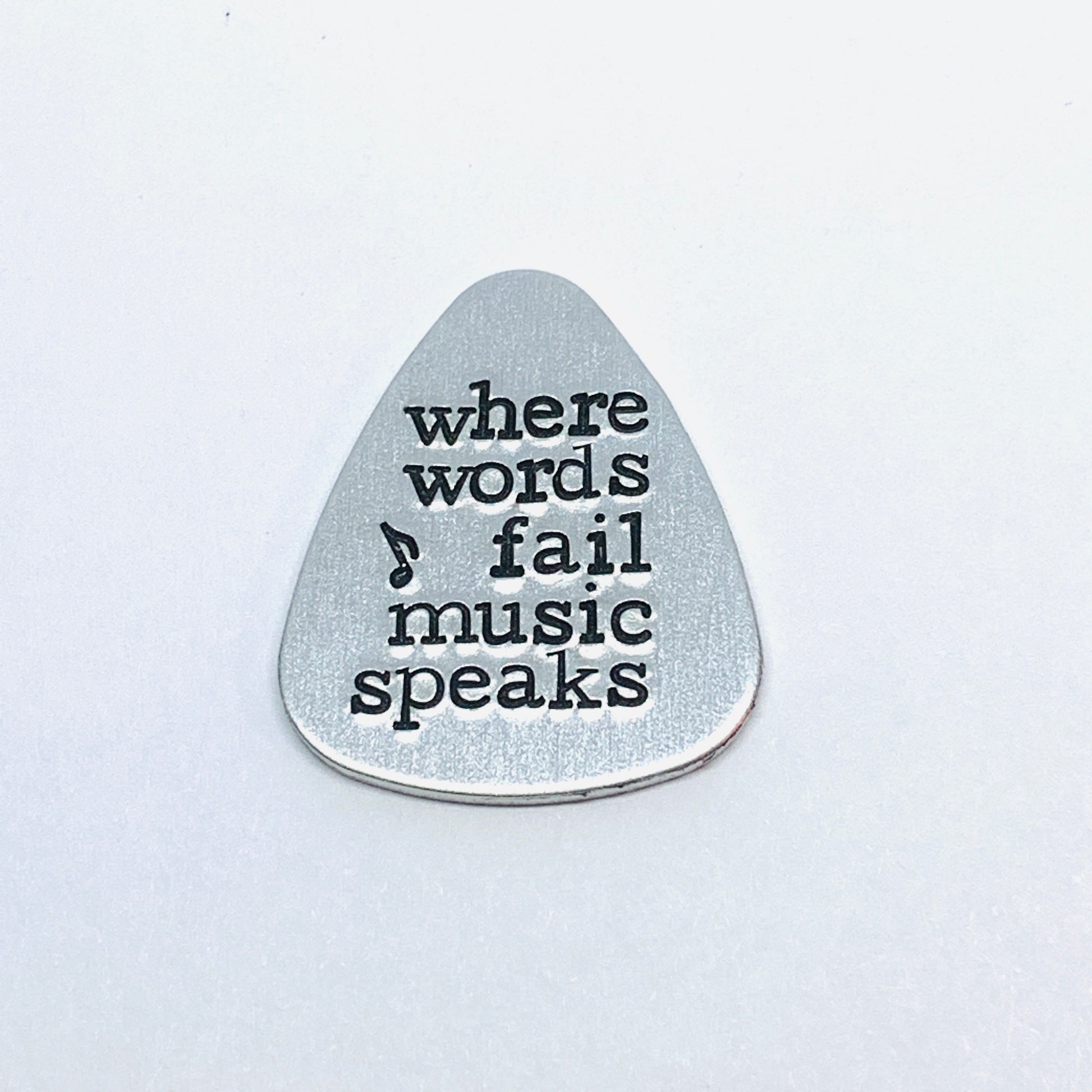 This listing is for one hand stamped aluminum metal guitar pick with the words “when words fail music speaks”.