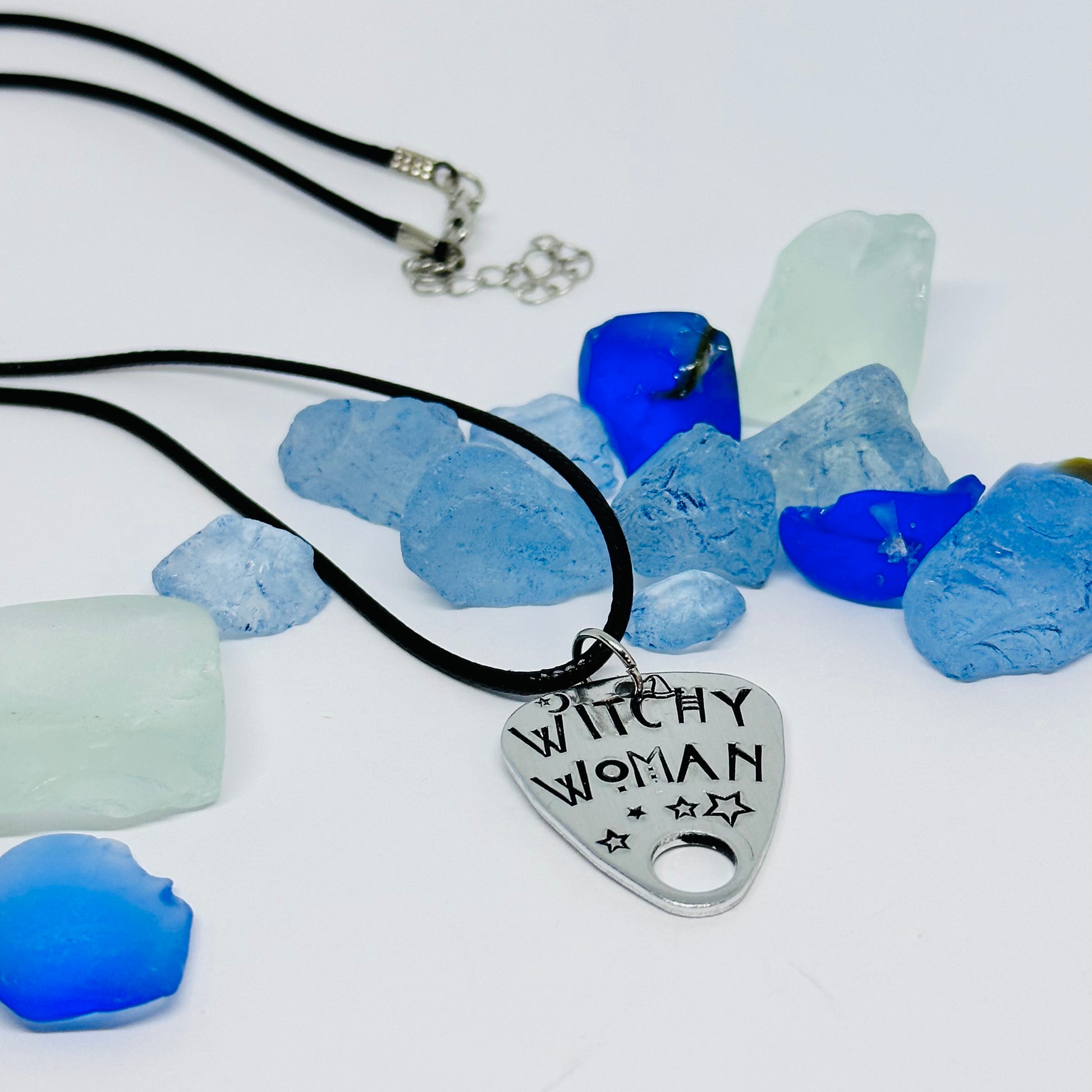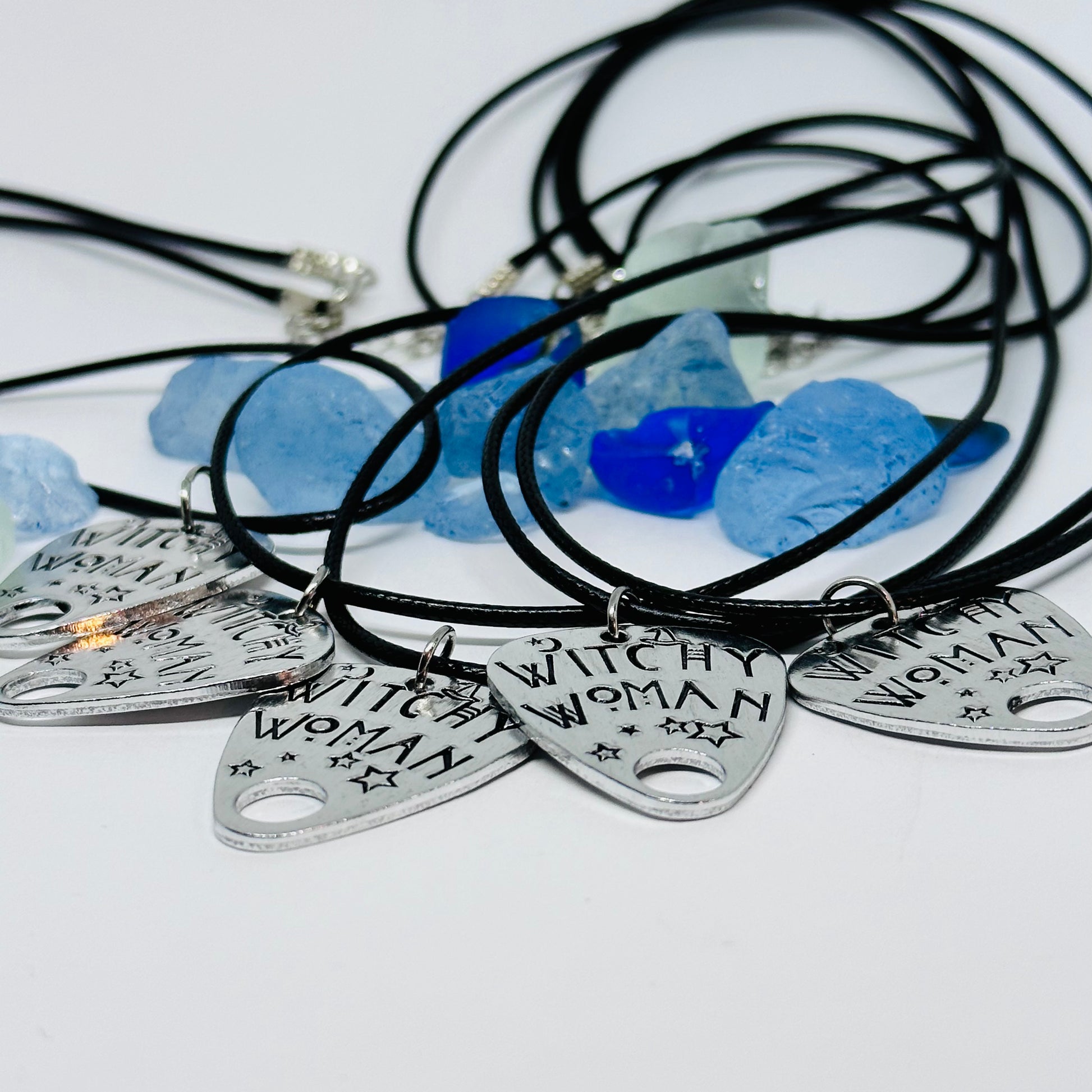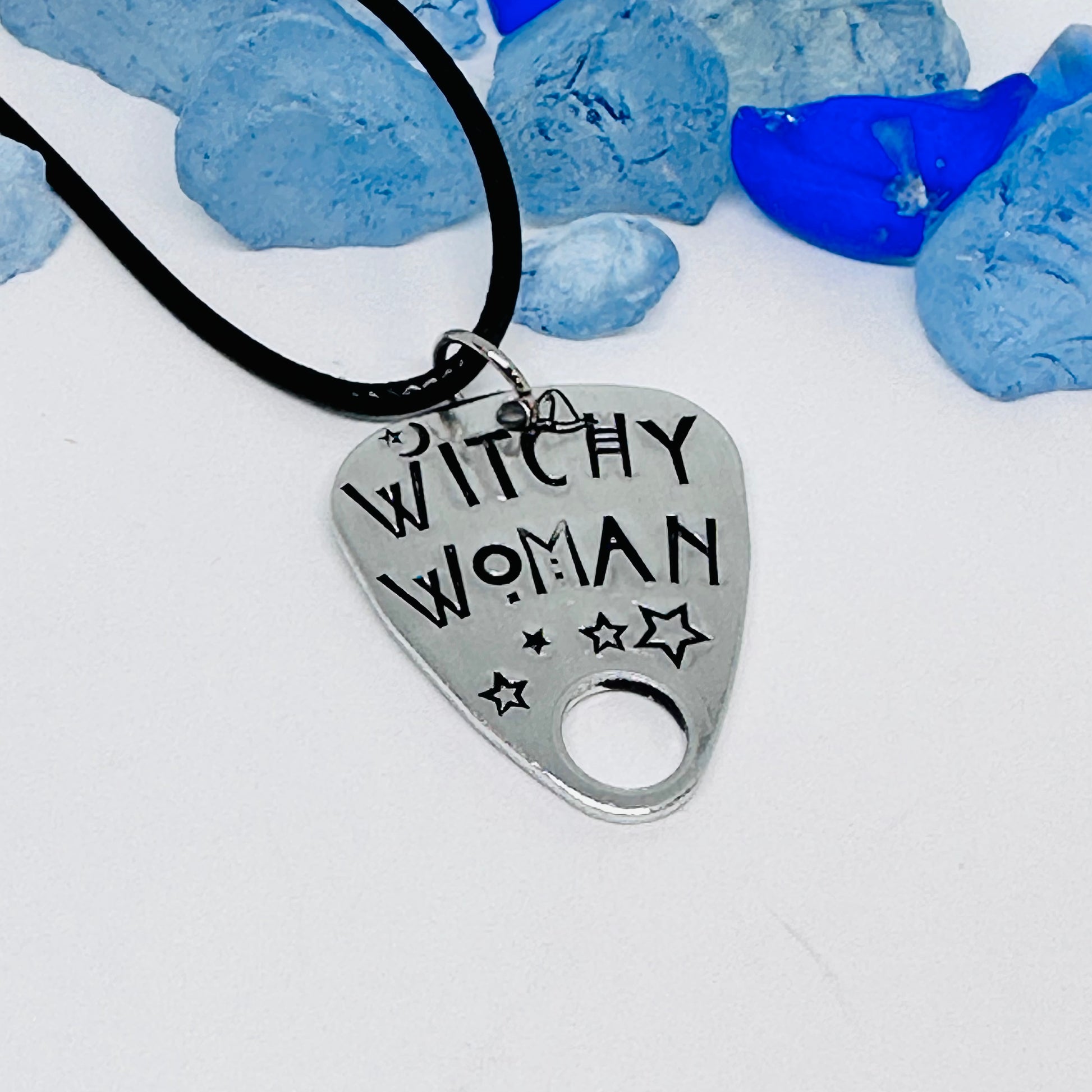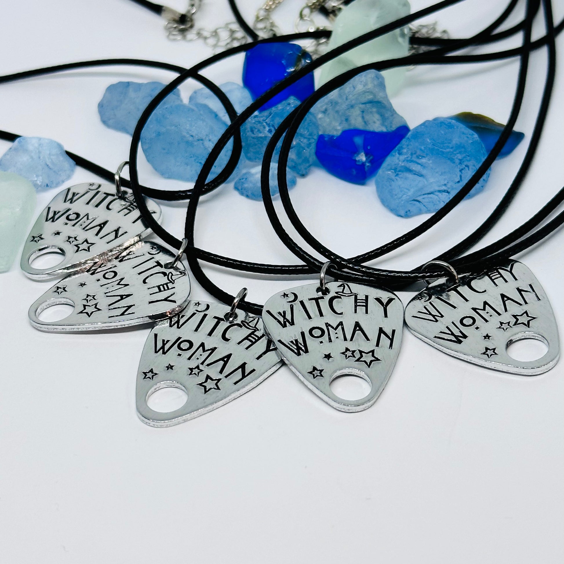 This listing is for one hand stamped aluminum metal “Ouija” planchette 18” black corded pendant. It features the words Witchy Woman on one side with strategically placed moon and stars on both sides.